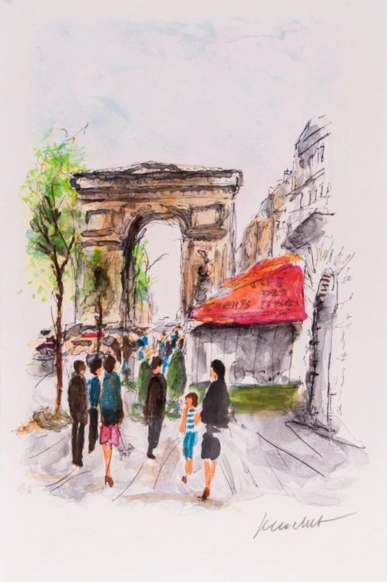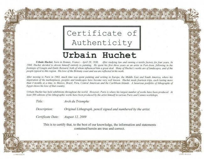 Urbain Huchet "Arch du Triomphe" Original Lithograph Signed and Numbered by the Artist comes with Certificate of Authentication size: 12" x 17.5" W45
