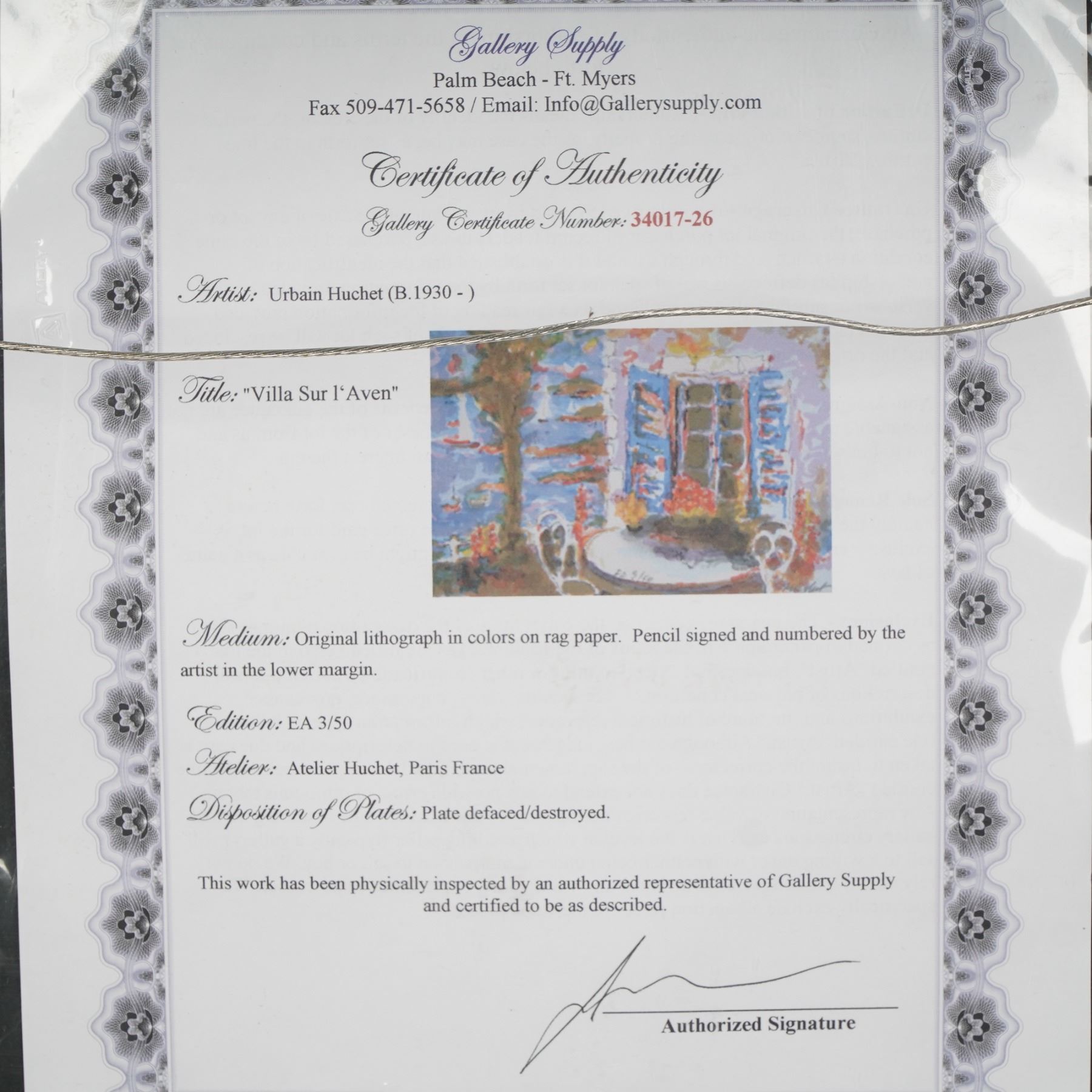 Urbain Huchet's Villa Sur l'Aven is a captivating original color lithograph that evokes the luminous charm of coastal France. Presented in a richly detailed and gold-leaf embossed frame with a black velvet matte, the scene depicts a sunny terrace with vibrant blooms and blue shutters opening to a serene seaside view filled with sailboats, emblematic of Huchet's love for Brittany's ports and Mediterranean flair. Urbain Huchet was a celebrated French post-impressionist known for his vibrant depictions of maritime life, markets, and architectural scenes across Europe and the Middle East. After leaving a career in law, Huchet dedicated his life to art, traveling extensively through Brittany, Venice, Egypt, and India. His work has been exhibited internationally and is prized for its vivid palette, dynamic linework, and romantic atmospheres. This limited edition print is numbered EA 3/50 (Epreuve d'Artiste) and signed in pencil by the artist in the lower right margin. Published by Atelier Huchet, Paris, the plate has been officially defaced, affirming the exclusivity of this edition. Included is a Certificate of Authenticity from Gallery Supply, Palm Beach, Ft. Myers, confirming its origin, edition, and inspection by an authorized representative.