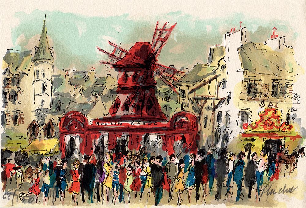 Huchet, Urbain (French, 1930 - 2014) "Le Moulin Rouge" Limited edition, hand signed and numbered lithograph. Sheet size 7 1/2 x 11 inches. This work is double matted and framed in a solid wood moulding. The frame is new. Dimensions: c. 15 x 19 inches. Accompanied by a Certificate of Authenticity.