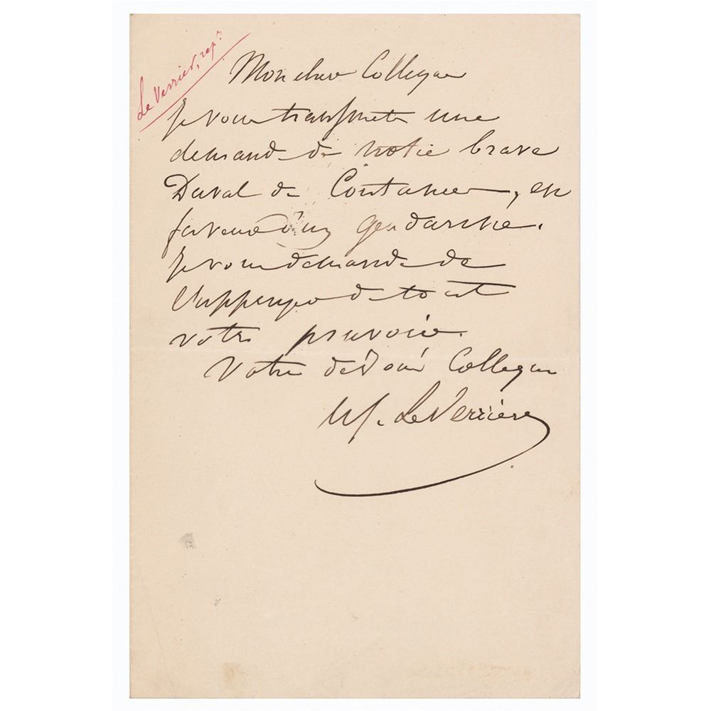 French mathematician who specialized in celestial mechanics (1811–1877) best known for his part in the discovery of Neptune. ALS in French, signed “U. Le Verrier,†one page, 5.25 x 8, no date. Untranslated handwritten letter to a colleague. In fine condition.