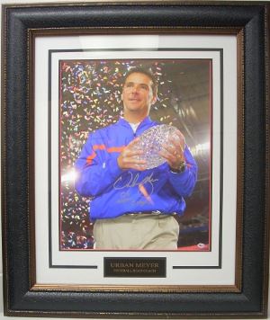 Urban Meyer hand autographed Florida Gators 16x20 Photo with 06 Nat Champs inscription. Custom Leather Framed and Matted. Famous Ink Hologram and Certificate of Authenticity from Athlon Sports.