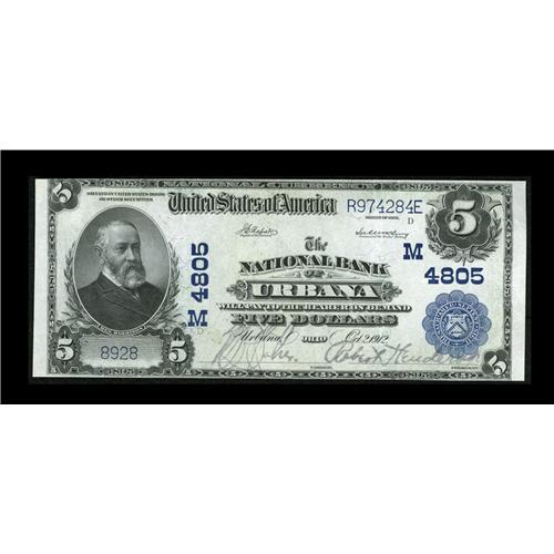 <B>Urbana, OH</B></I> - $5 1902 Plain Back Fr. 602 <B>The NB of Urbana</B></I> Ch. # (M)4805<BR>A bright <B>About Uncirculated</B></I> with legibly stamped officers' signatures. This note is the highest grade of any of the seven $5 Plain Backs documented in the census.