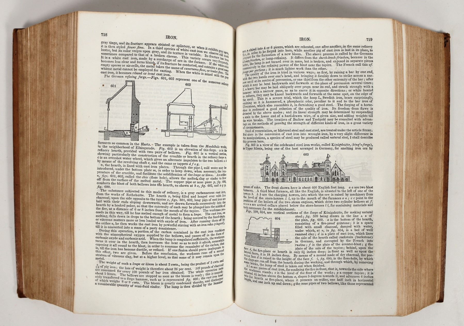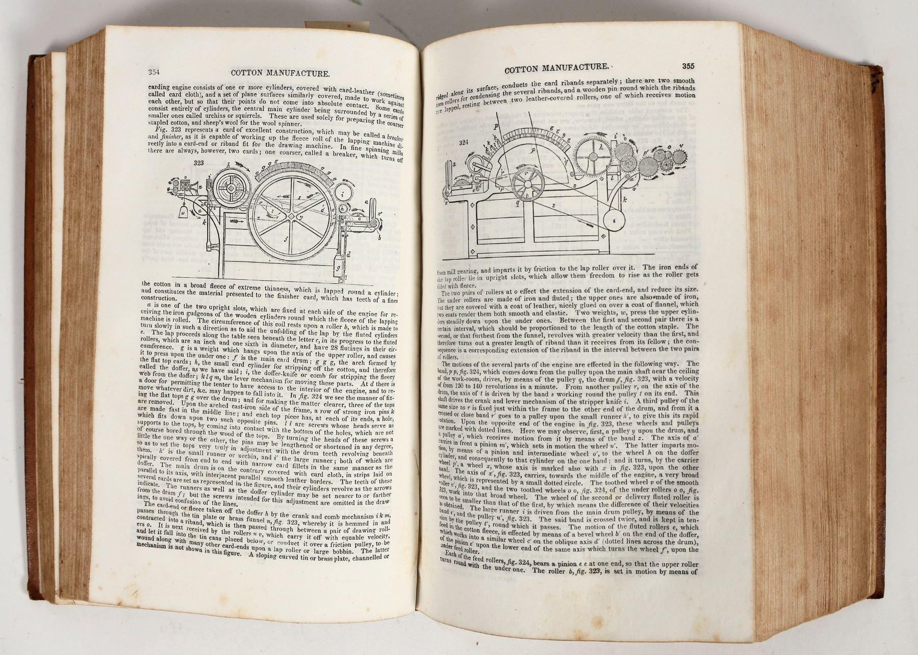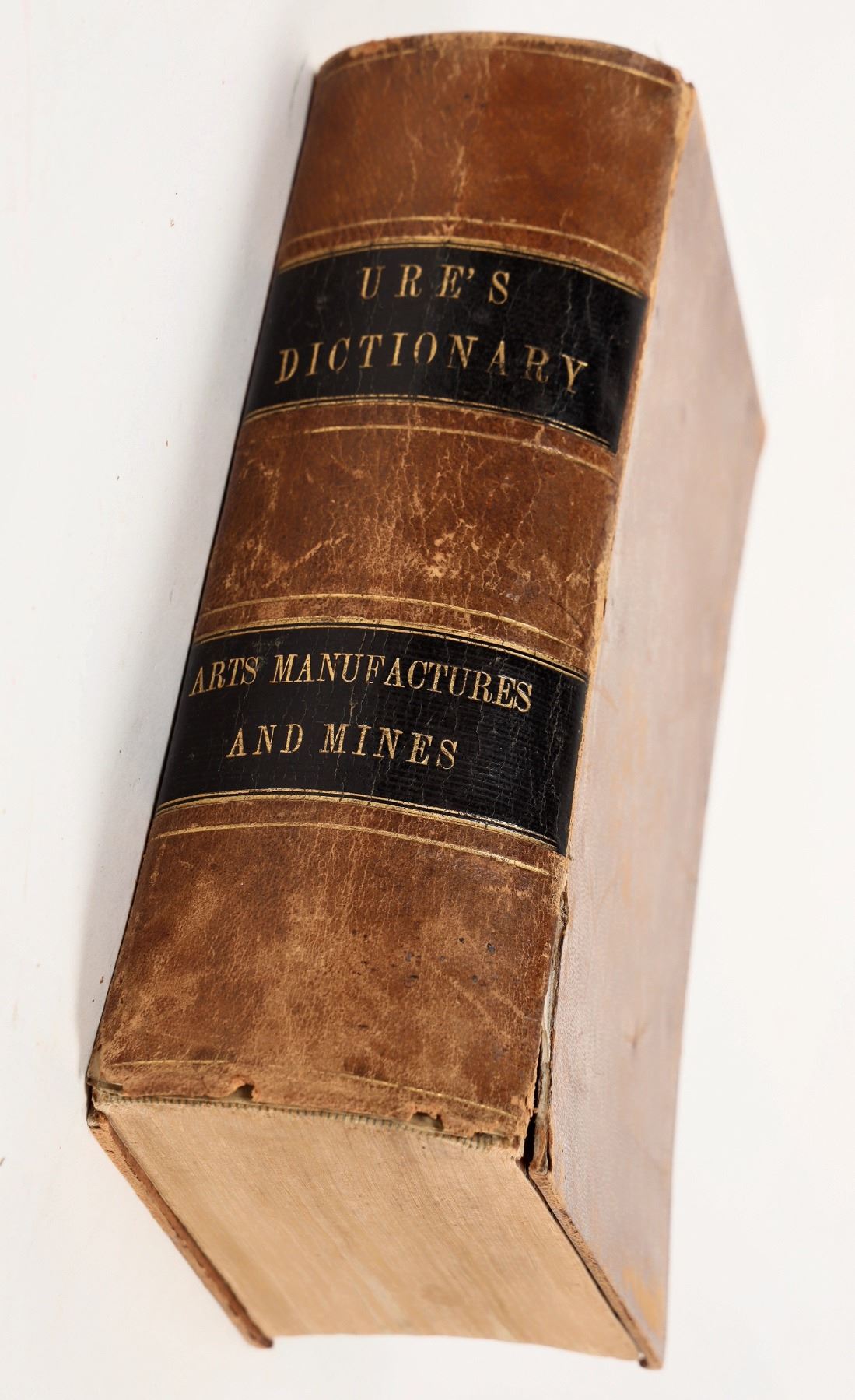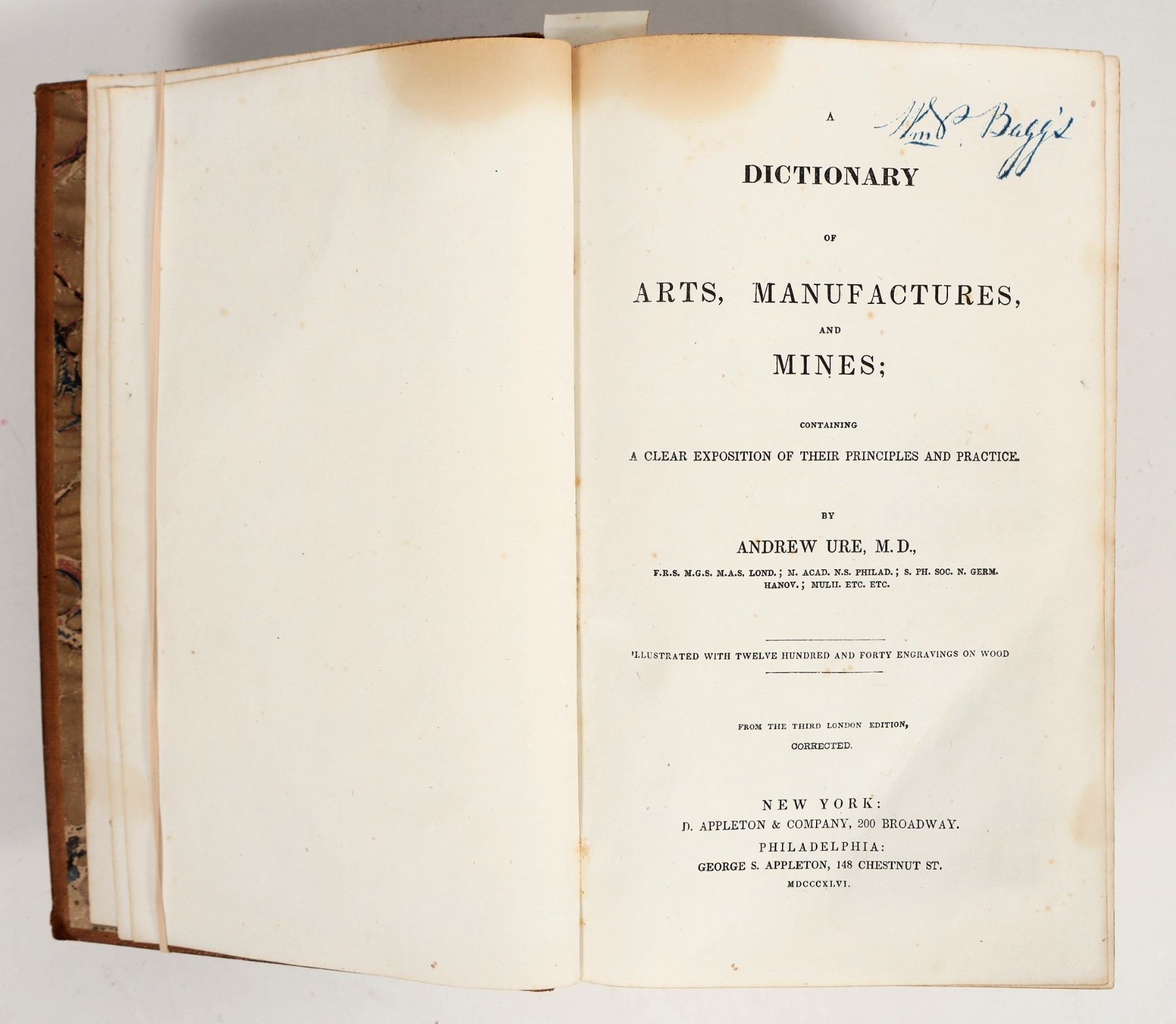 Ure's Dictionary of Arts, Manufactures and Mines Containing a clear exposition of their principles and practice. By Andrew Ure, M. D. Illustrated with twelve hundred and forty engravings on wood. From the third London edition, corrected. New York: D. Appleton & Company. Philadelphia: George S. Appleton. 1846. Leather bound, complete 1340 pages plus 12 pages from the Publisher advertising other works. Important reference, cited by FH regularly, and the single most important scientific dictionary of its kind at the time, filled with thousands of useful statistics and technical information, including export figures, descriptions of machinery, and tables depicting elements and organic chemistry, and much more. Ure's dictionary became the standard reference work in the nineteenth century. Profusely illustrated with twelve-hundred-and-forty engravings on wood. This copy is signed in ink on the cover page Wm. P. Bagg, who was an important, well-known British wood cut artist/engraver who worked in the 1820s-1840s. He created art for wood engravings that were cut by his father, Thomas Bagg, and the pair worked out of a shared location at 8 Hart Street in London. William Bagg and Thomas Bagg are mentioned in many important reference works, such as British Art Studies, Issue 20, July 2021; Wordsworth, Christopher, 1807-1885Greece, pictorial, descriptive and historical 1839 held by the Yale Center for British Art; and Wood Engraving and the Illustration of American Surgical Texts during the Nineteenth Century by Christopher Hoolihan, among many others. Additionally one of the Bragg prints from a book illustration is held in the collection by the British Museum of Art. Wood engravings designed specifically for the London editions of The Surgeon's Vade Mecum were those of William Bagg, as well the first American edition of Robert Liston's Practical Surgery, from 1838, which contains 120 wood engravings faithfully copied from the original designs that had been engraved on wood by William Bagg under Liston's own supervision. This original, Key reference work was originally owned by and autographed by an important British artist and the condition is very fine for it's age. Because Ure does not credit the wood cut engraving artist(s) who created the 1200 plus illustrations in this early edition, and due to the similarity of the Ure illustrations to the works of William Bagg referenced above, we believe it is highly likely that William Bagg is one of the artists, if not the only artist responsible for the wood cut engravings prolific in this Dictionary. Due to the importance of Ure's work, the illustrator would be greatly esteemed had he been credited. Please see photos. Bagg is not found in international newsdpapers.com, nor Niles Register.