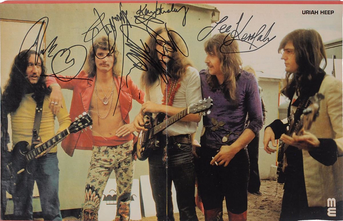 Color 19.5 x 12.25 magazine centerfold photo of Uriah Heep, signed in black felt tip by Lee Kerslake, Ken Hensley, Mick Box, David Byron, and Gary Thain. Affixed to a slightly larger scrapbook page and in fine condition, with some wrinkling and handling wear. Consignor notes that these vintage signatures were obtained in person in Vienna during the early to mid-1970s.