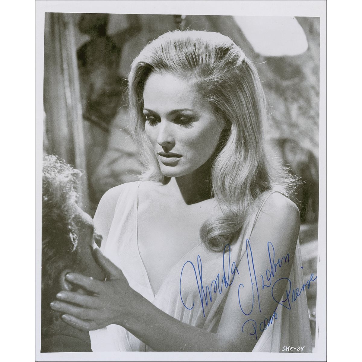 Vintage glossy 8 x 10 publicity photo of Andress from the film, She, signed and inscribed in-person in fountain pen, “Ursula Andress, Pour Pierre.” In fine condition, with light uniform surface rubbing.