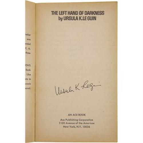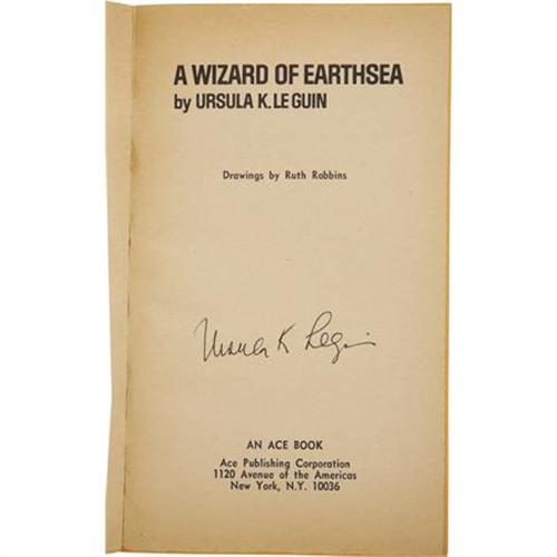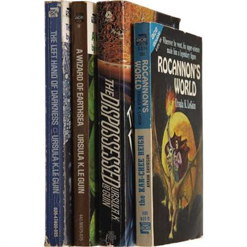 <B>Ursula K. LeGuin: Four Books.</B></I> Includes the following:<BR><B><I>A Wizard of Earthsea (Signed).</B></I></B></I> (New York: Ace Science Fiction Book, 1968), mass market edition, 205 pages, illustrated wraps, 12mo. Condition: very good.<BR><B><I>Rocannon's World (</B></I></B></I><B>Ace Double</B></I><B><I> </B></I></B></I><B>with</B></I><B><I> </B></I></B></I><B>Avram Davidson</B></I><B><I>: The Kar-Chee Reign).</B></I></B></I> (New York: Ace Books, 1966), first double novel edition, 255 pages, illustrated wraps, 16mo. Condition: good.<BR><B><I>The Left Hand of Darkness (Signed).</B></I></B></I> (New York: Ace Science-Fiction Books, 1969), first edition, 286 pages, illustrated wraps, 12mo. Condition: good.<BR><B><I>The Dispossessed (Signed).</B></I></B></I> (New York: Avon, 1975), first paperback edition, 311 pages, illustrated wraps, 12mo. Condition: good<BR><BR><b>Shipping:</b> Books & Catalogs (<a target="_blank" href="http://www.heritageauctions.com/common/shipping.php">view shipping information</a>)