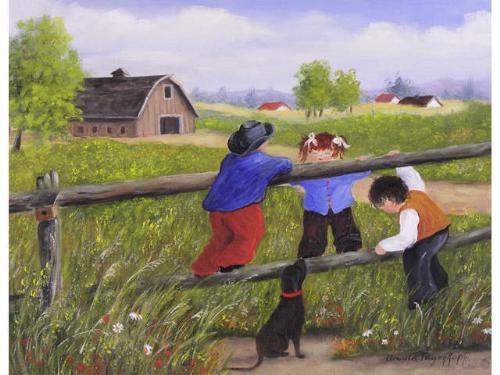 [Canadian/German 20th century] ON THE OTHER SIDE OF THE FENCE Acrylic on board 14 x 18 ins. -Signed & titled