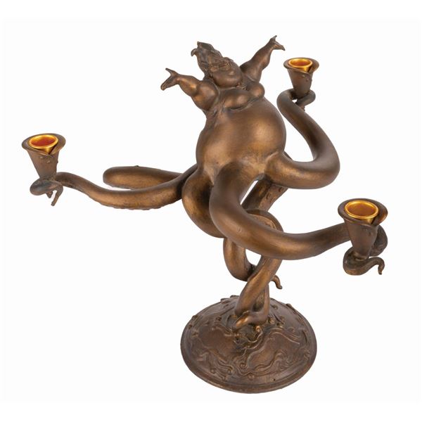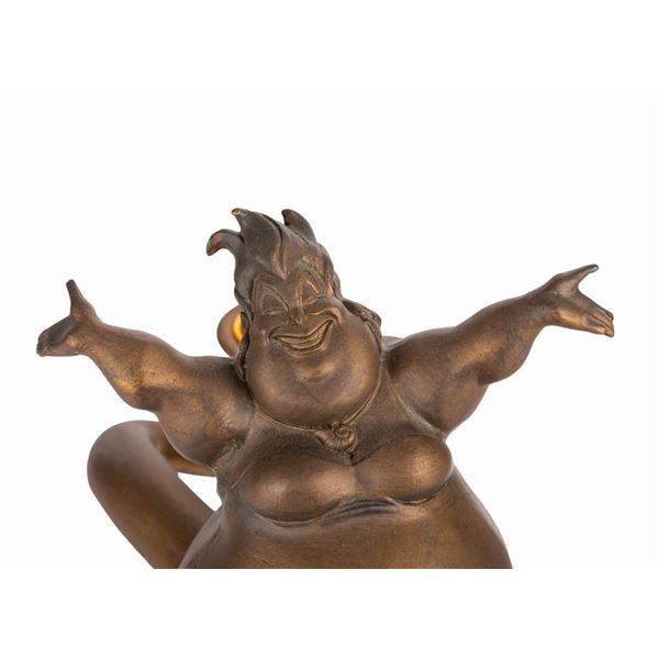 (Disney, c.2000s) A limited edition bronze candelabra in the form of Ursula from Disney's The Little Mermaid. Designed by Jody Daily, the sea witch is depicted with her signature smug smile, reveling in a sinister scheme as her tentacles swirl about her. Four of the appendages grip conical candle cups, and two interlace to form the candlestick. The half-dome base is intricately sculpted with churning sea detailing. Created in an edition of 1000, the candelabra is accompanied by a Disney COA and measures 14" tall by 14" in diameter. The piece remains in fine condition with light oxidation and detachment of the felt on the bottom of the base.