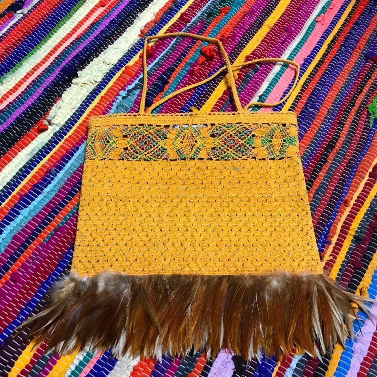 Original, early 2000's Ursule Beaugeste Paris, macreme woven, multi-colored handbag purse with feathers attached at bottom. Purchased from Neiman Marcus. In new/ unused condition. Zippered interior pocket with tag "ursule beaugeste Paris, Made in France."  Bag width 11 1/2" X 9" H with 4" feathers attached at bottom. 8" strap.  luxurious, bohemian-esque handbag purse,Â