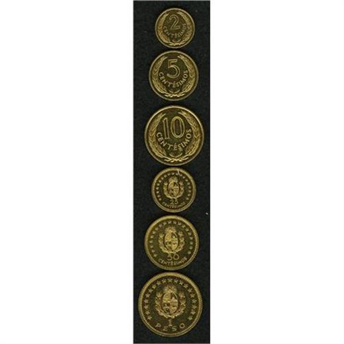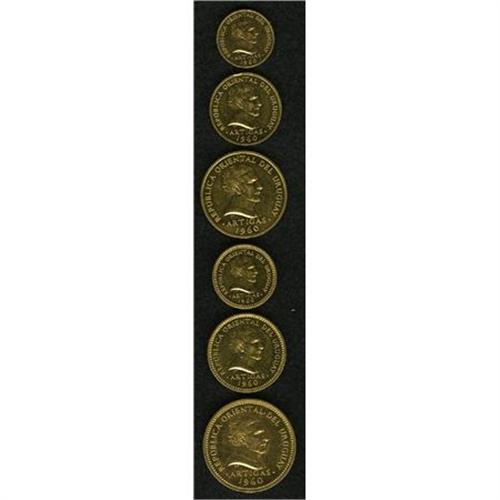 <B>1960 gold Presentation Pattern Set,</B></I> KM-Pn53 through Pn58, the complete six coin series comprising the 2, 5, 10, 25, 50 Centesimos and Peso, KM37-42, all struck in gold and choice prooflike UNC. Only 100 pieces were struck for each type. Very rare and desirable set!<BR><BR><b>Shipping:</b> Coins & Currency (<a target="_blank" href="http://www.heritageauctions.com/common/shipping.php">view shipping information</a>)