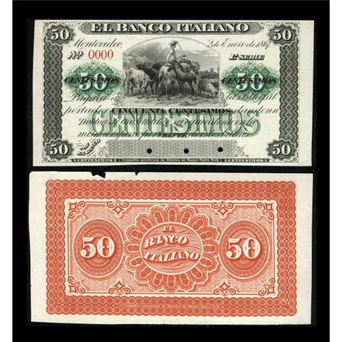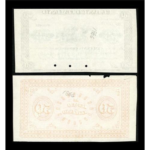 <B>Uruguay </B></I>50 Centesimos El Banco Italiano 1867 Pick S202 Face and Back Proofs<BR> Krause only has "dashes" for the values of the proofs for this bank. The face proof grades <B>Choice CU </B></I>with three small punch cancels and a pencilled "1866" on the back. The <B>CU </B></I>back proof also has a pencilled "1866" on the back plus the top edge shows a tear and some chipping.<BR><BR><b>Shipping:</b> Coins & Currency (<a target="_blank" href="http://www.heritageauctions.com/common/shipping.php">view shipping information</a>)
