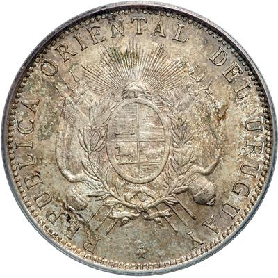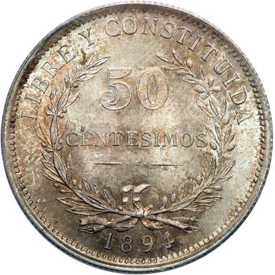Uruguay. 50 Centesimos, 1894. KM-16. Arms. Reverse: Value within sprays, date below. Rare grade. PCGS graded MS-66.