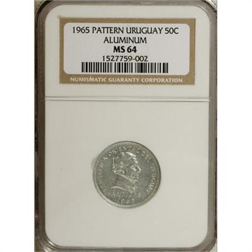 <B>Republic Aluminum Pattern 50 Centesimos 1965,</B></I> unlisted in KM, similar to Pn65, MS64 NGC.<BR><BR><b>Shipping:</b> Coins & Currency (<a target="_blank" href="http://www.heritageauctions.com/common/shipping.php">view shipping information</a>)