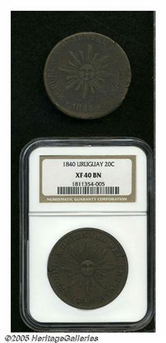 <B>Republic Copper Tandem, </B></I>KM2.1 20 Centesimos 1840, XF40 Brown NGC, a very well-struck example of this first date, few edge cracks as made, but overall an attractive coin, and KM3 40 Centesimos 1844, Fine, weak in part and small planchet flaws.