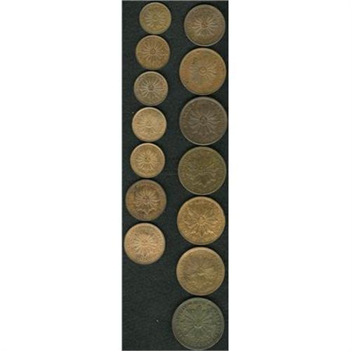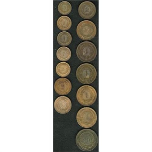 <B>Republic Sunface Bronze Selection,</B></I> a high-grade collection of these attractive European mint types including: KM8 5 Centesimos 1857D glossy brown XF, KM9 20 Centesimos 1857D XF, few tiny flaws, KM10 40 Centesimos 1857D VF with small edge bumps, KM11 1 Centesimo 1869H (2) lustrous UNC, possibly ex Heaton Mint Collection, KM12 2 Centesimos 1869H toned AU-UNC, KM13 4 Centesimos 1869H (2), XF and AU, and Paris Mint strikings: KM11 1 Centesimo 1869A (2), lustrous UNC, KM12 2 Centesimos 1869A (2), AU and UNC, and KM13 4 Centesimos 1869A (2), AU and UNC. <B>Sold as is, no return lot.</B></I><BR><BR><b>Shipping:</b> Coins & Currency (<a target="_blank" href="http://www.heritageauctions.com/common/shipping.php">view shipping information</a>)