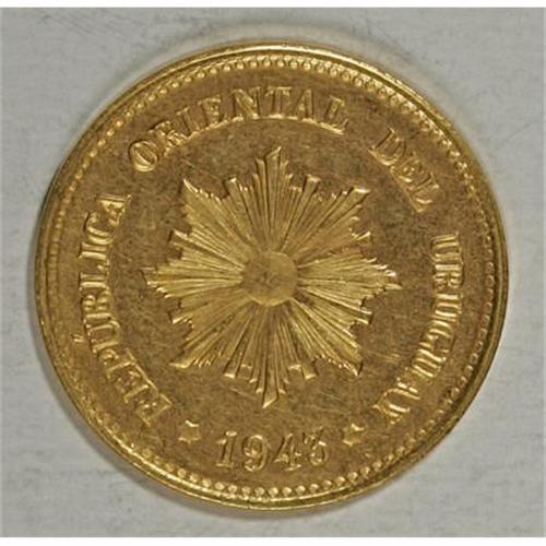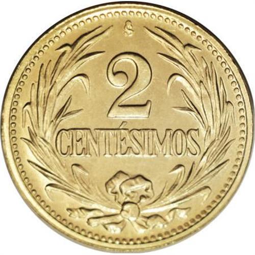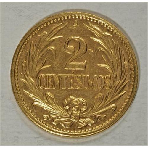 <B>Republic gold Pattern 2 Centesimos 1943-So,</B></I> KM-Pn44, choice Proof, mintage unknown but certainly very rare. Plain edge, 6.81 grams. <BR><BR><b>Shipping:</b> Coins & Currency (<a target="_blank" href="http://www.heritageauctions.com/common/shipping.php">view shipping information</a>)