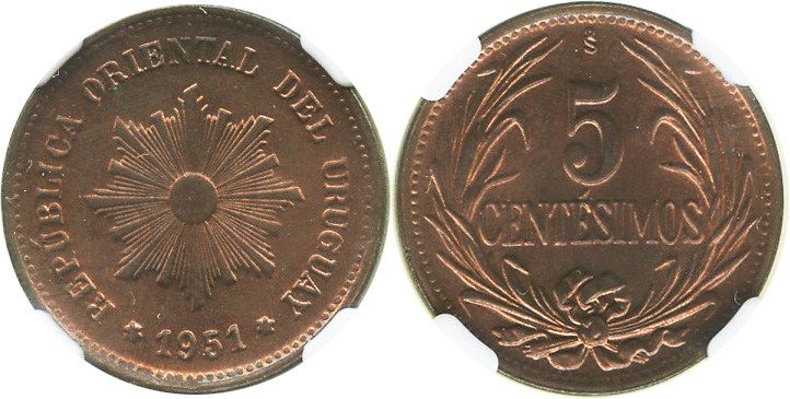 Uruguay (struck in Santiago, Chile), copper 5 centesimos, 1951-So, encapsulated NGC MS 64 RB.