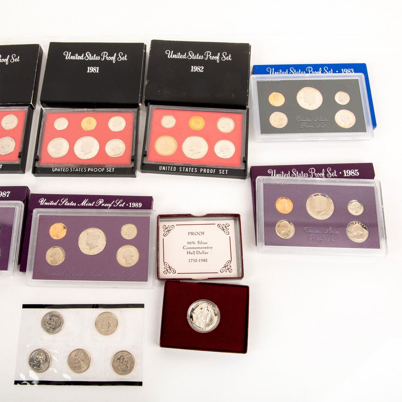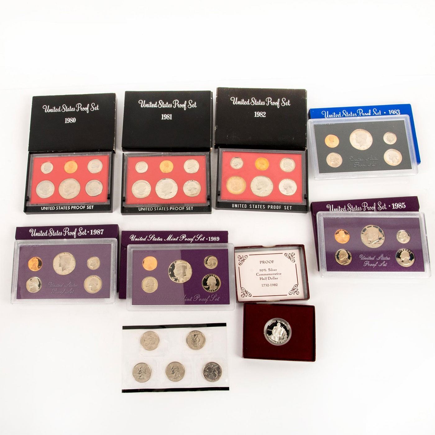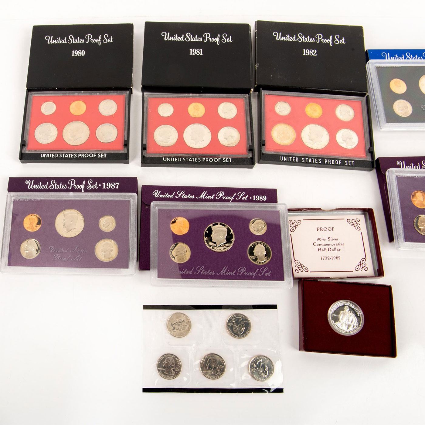 The lots sets include: 7 "The mint silver proof set" sets(1980,1981,1982,1983,1985,1987,1989). 1 "small" 2000 mint proof set. 1 George Washington silver commemorative half dollar (1732-1982). Coins and Currency, Numismatists