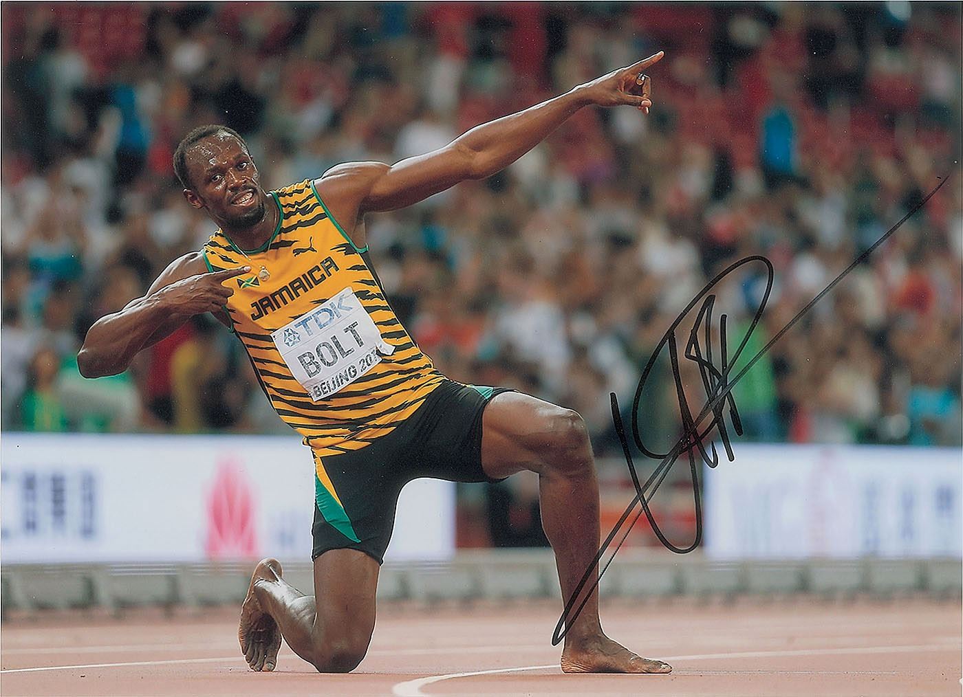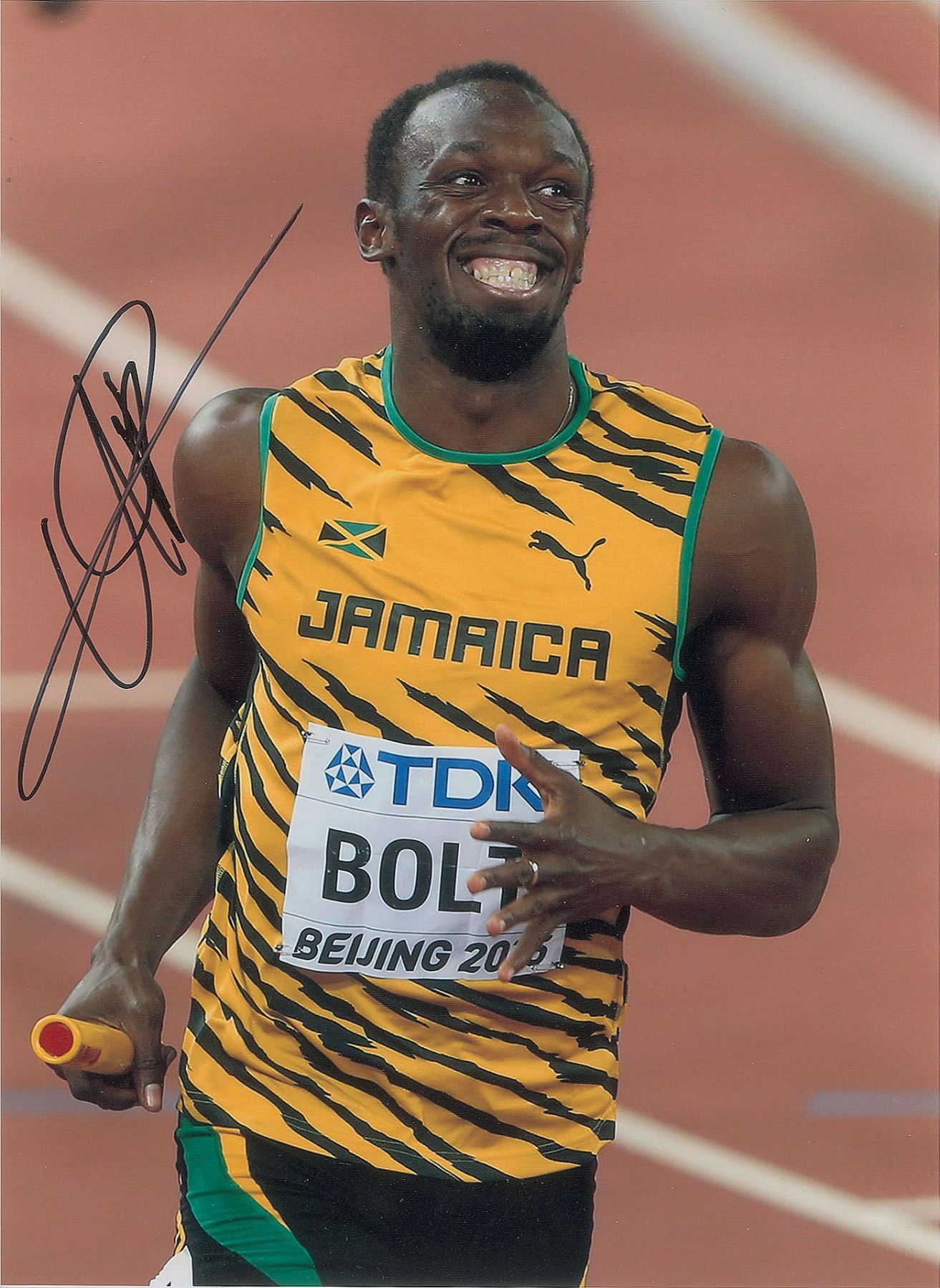 Two color satin-finish photos of the Jamaican sprinter and Olympic Summer Games legend, 8 x 11 and 11 x 8, both signed in black felt tip by Bolt. In overall fine condition, with a small edge crease to each photo.