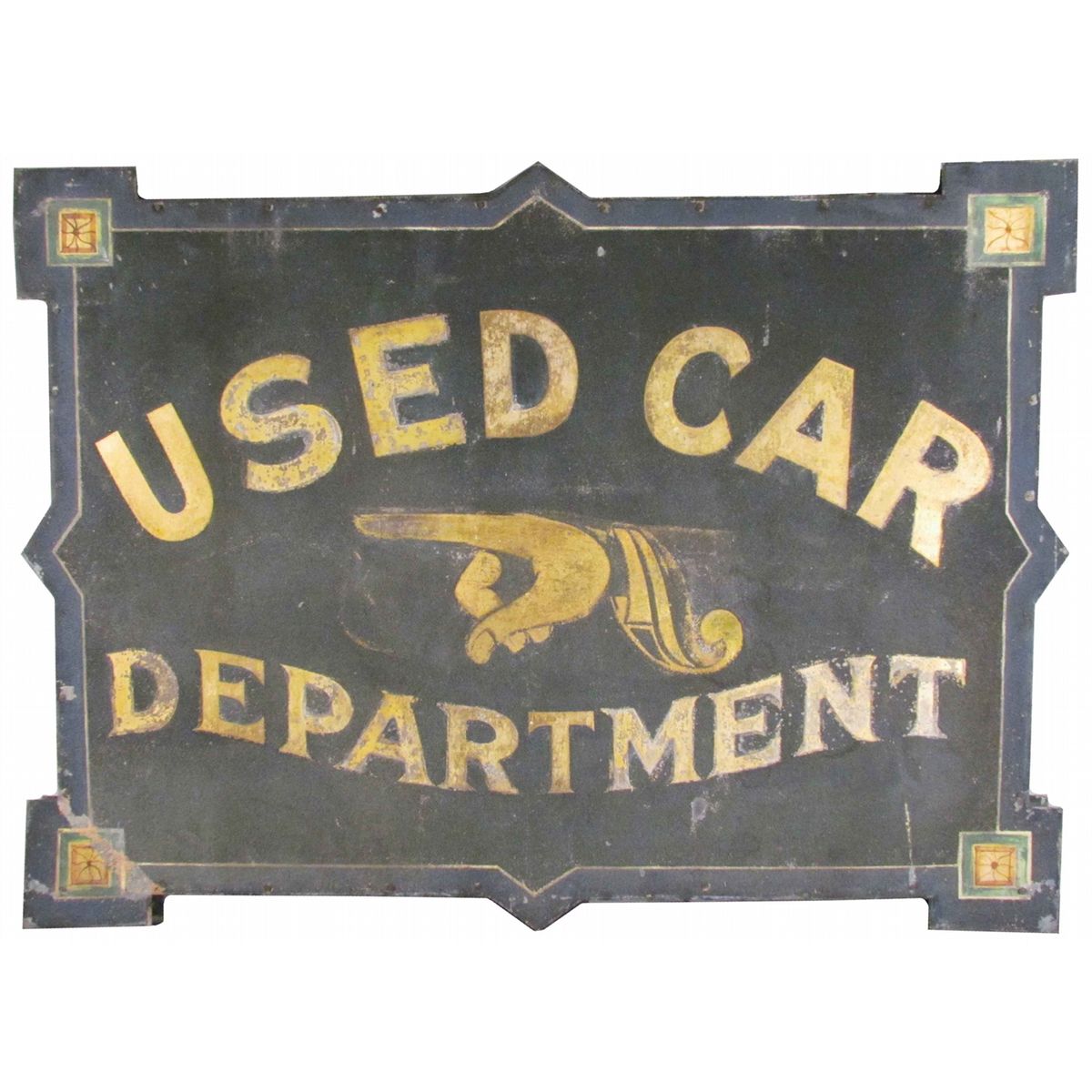 Used Car Department Outdoor Tin Sand Sign. Two sided, two signs mounted on inner support boards. 100% original condition. Very good condition. 33 X 24 X 1 inch.
