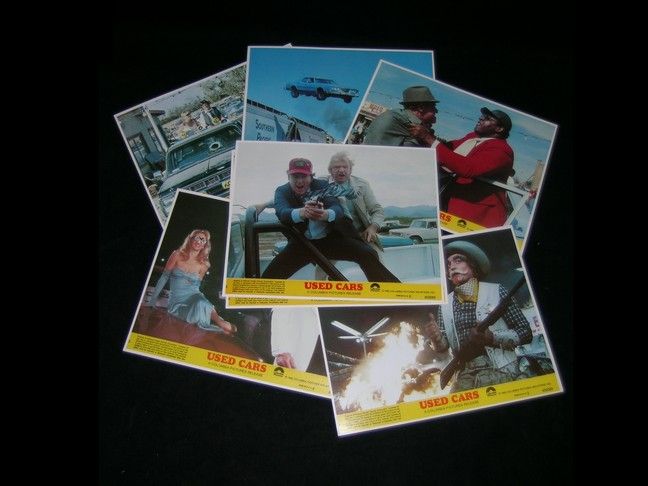 Complete set of eight lobby cards for the 1980 film Used Cars, Robert Zemeckis' unique comedy starring Kurt Russell and Jack Warden. Scenes depict the film's stars in a variety of comedic situations. (approx. 8" x 10")