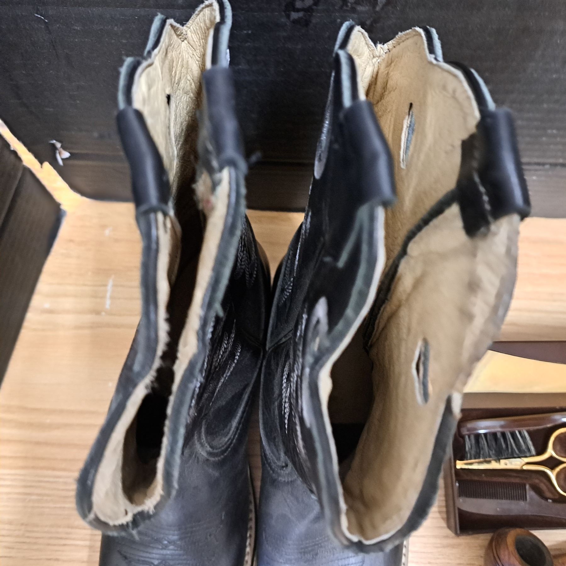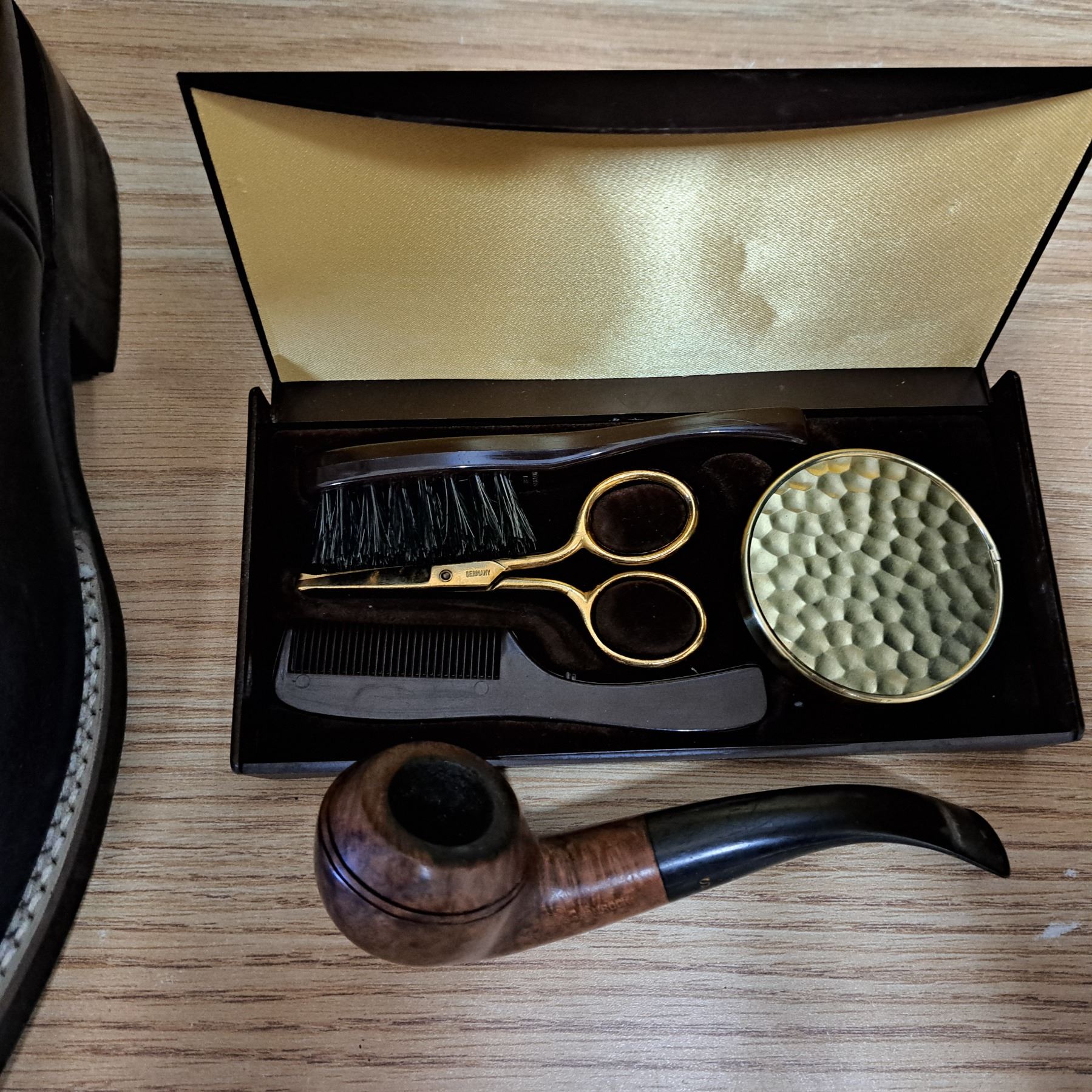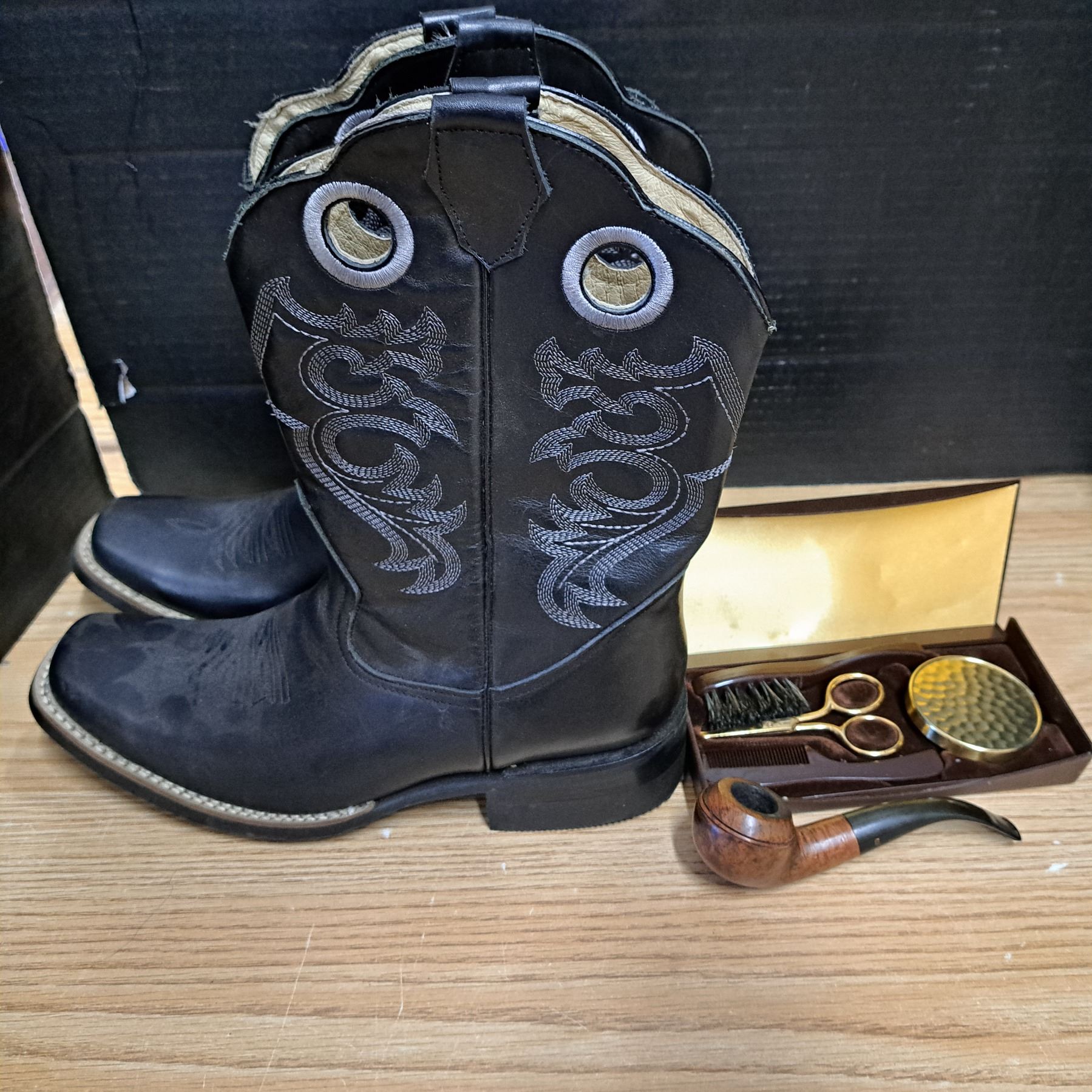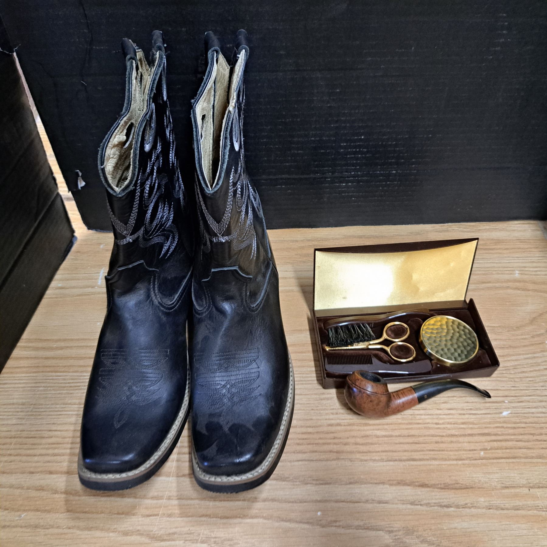 Used pipe from ireland, grooming kit and cowboy boots (size 7 mens?, measure 11.5" heel to toe)