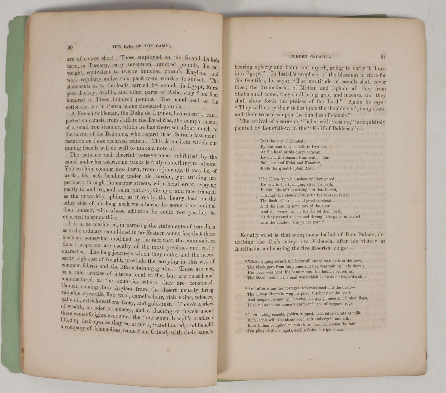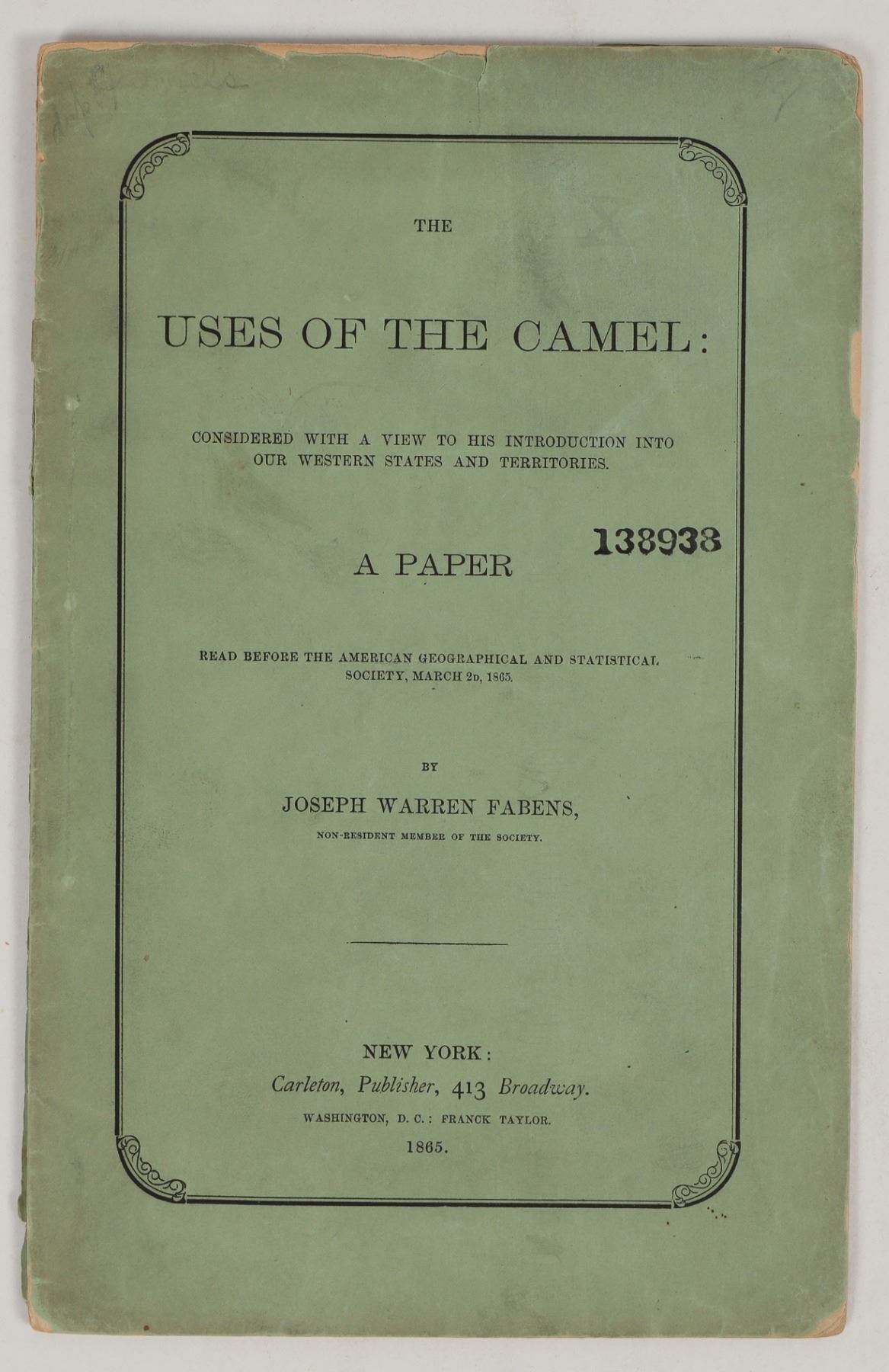 Uses of the Camel, by Joseph Warren Fabens, 1865, 32 pages. Read before the American Geographical and Statistical Society, argued for the use of the camel for pack and transport in the Western U.S., based on the U.S. Army's Camel Corp. experience from 1856-66. Back cover has separated.