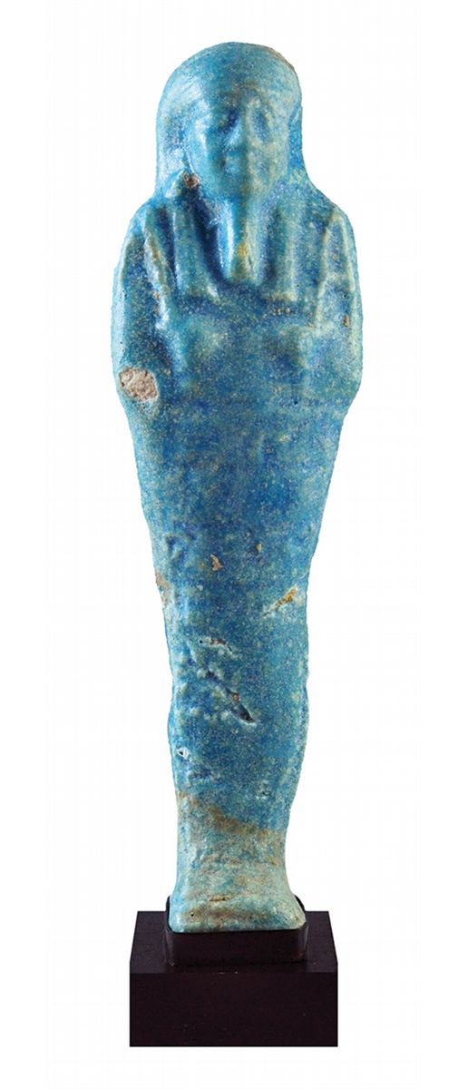 Ushabti. Baja época (alrededor del 664-323 a.C.). Fayenza color azul. Altura 17,5 cm. Incluye peana.