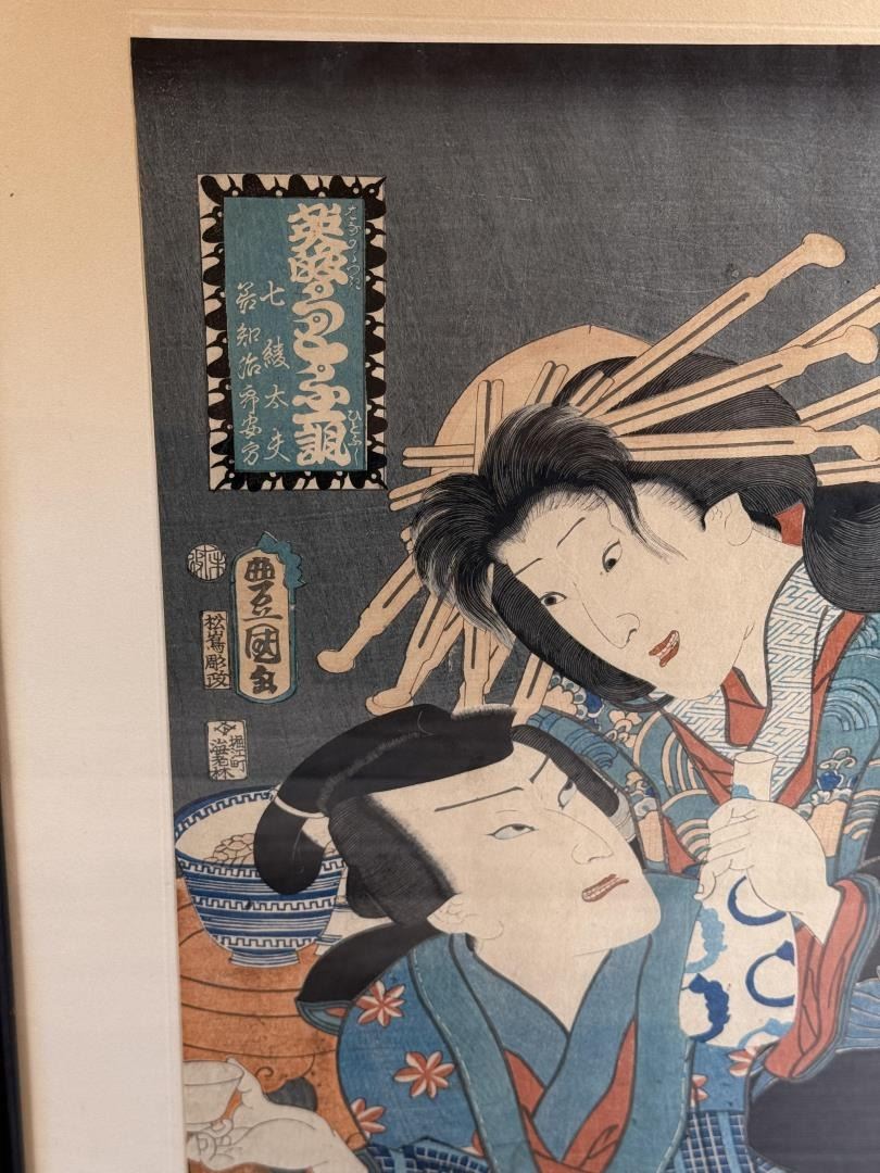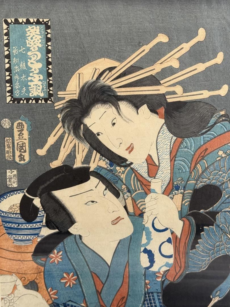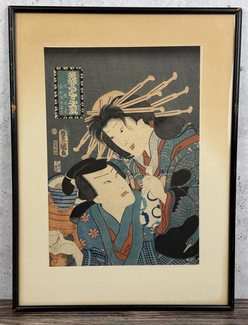 Nice antique print, dated 1855. From the Seven Komachi/Modern Genji series. Published by Iseya Kanekichi. Print measures 9 3/4" by 14 1/8" and entire piece is 14 1/2" by 19 1/2" framed.