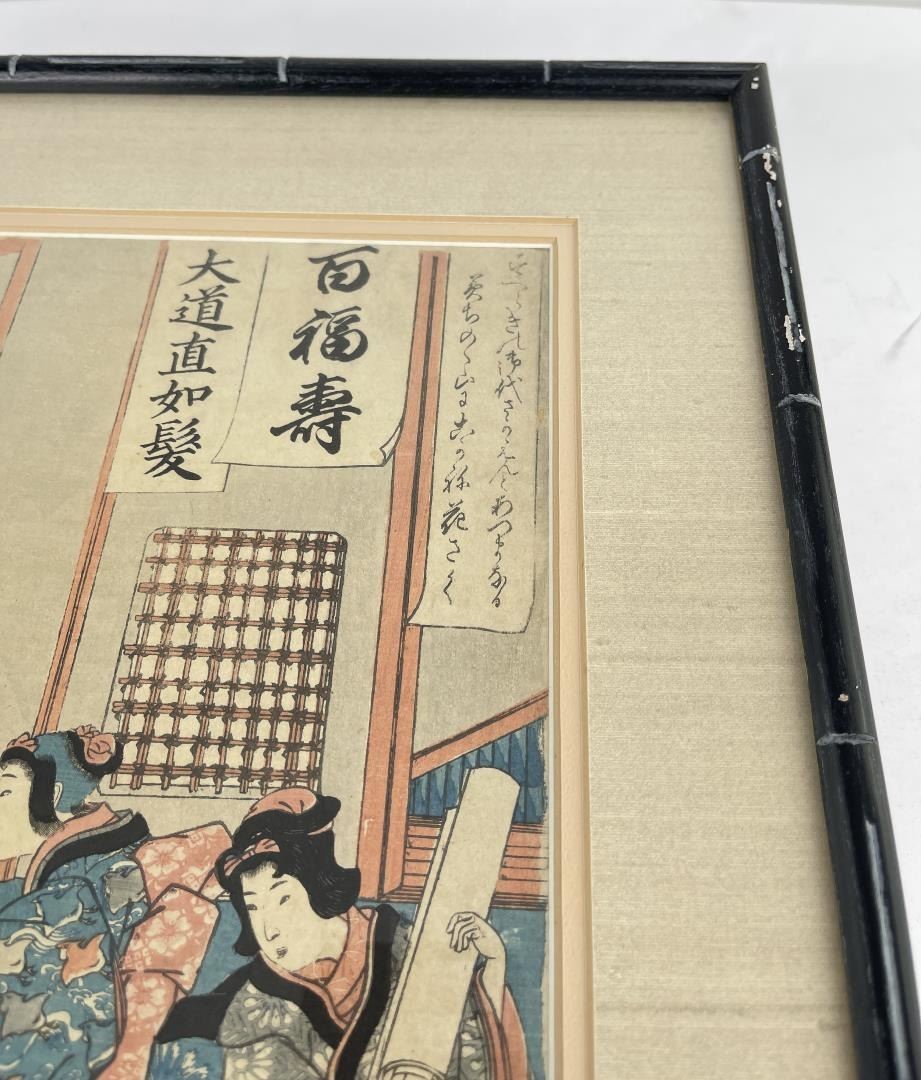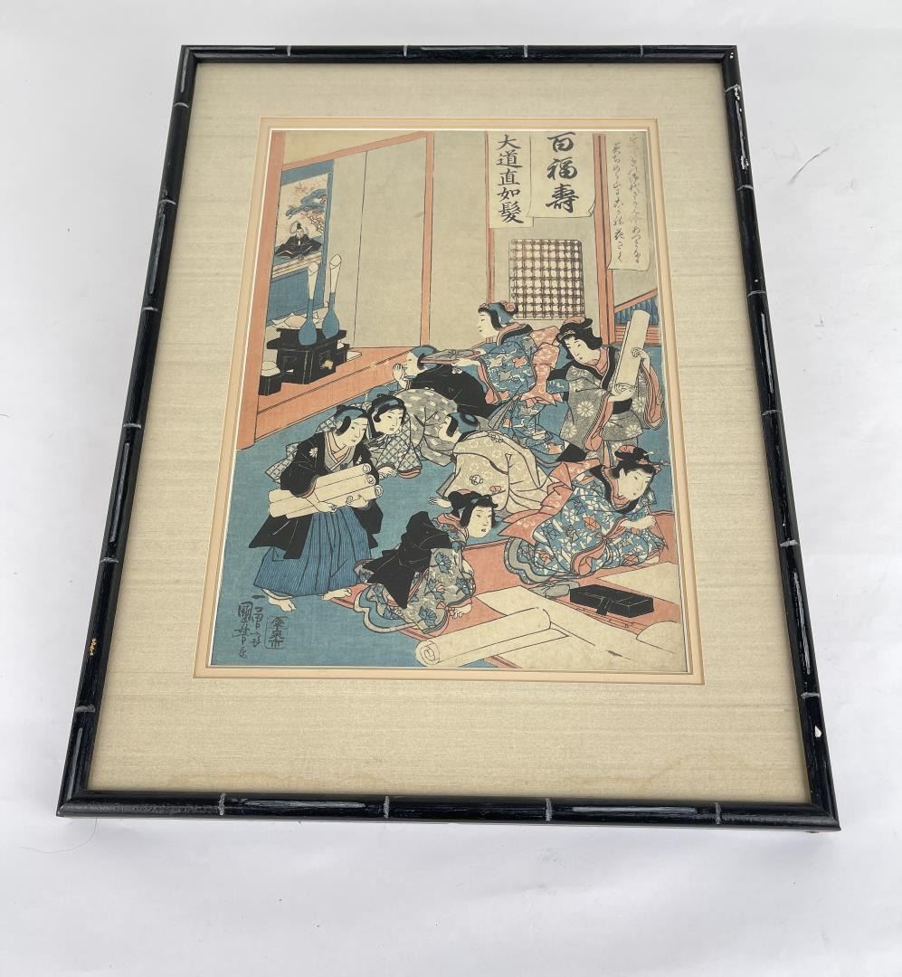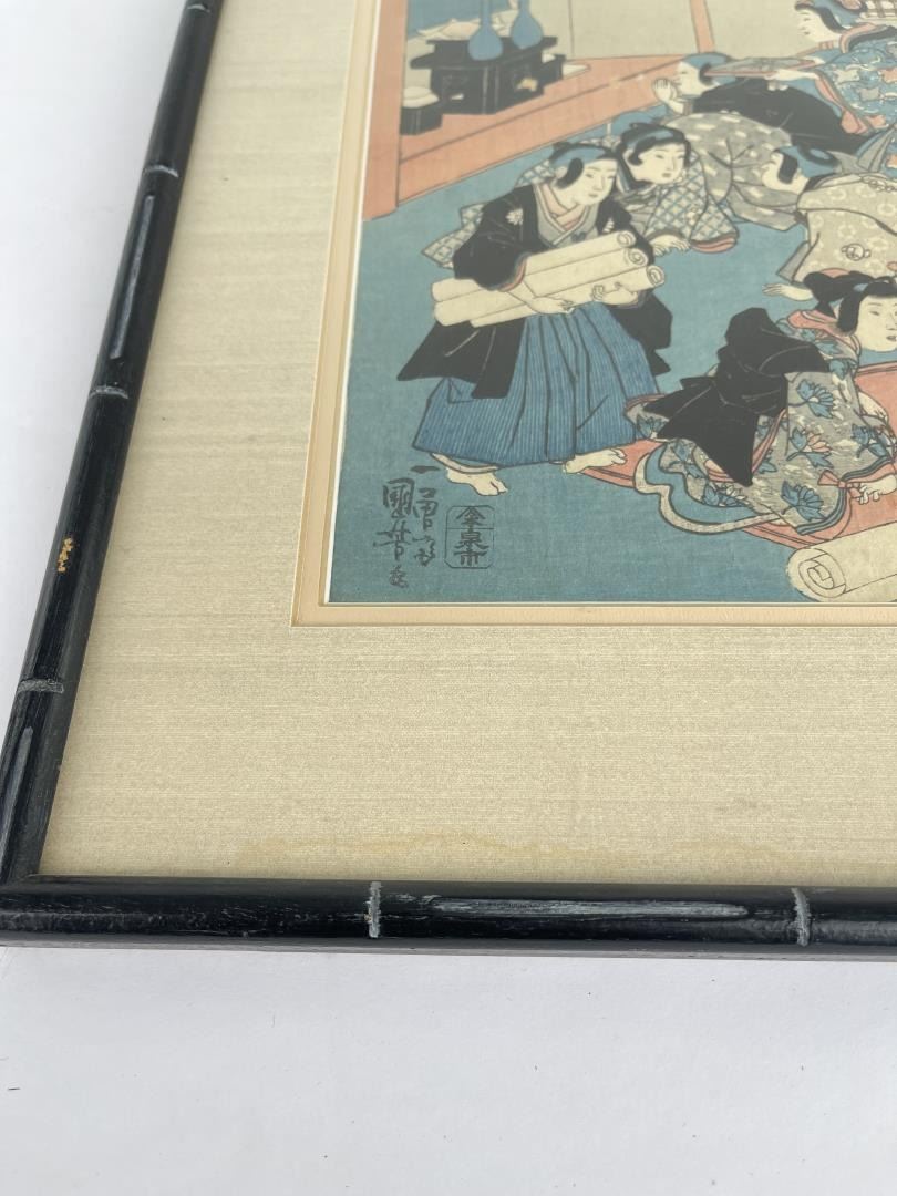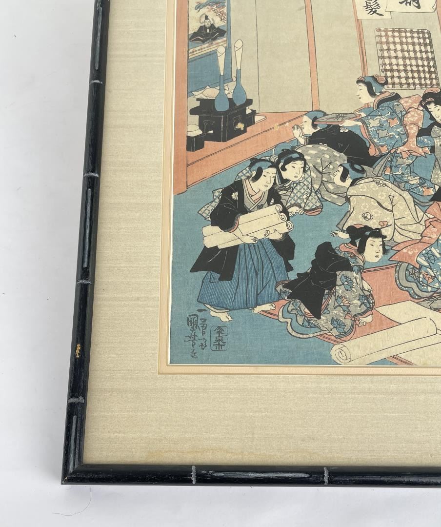 "A Children's Writing Contest", circa 1844 15" x20" framed. Kuniyoshi (1797 - 1861) The son of silk dyer, Kuniyoshi Utagawa was born into the Igusa family in Edo. Little is known about his very early years, though he is said to have shown remarkable talent from a young age. Kuniyoshi began his ukiyo-e career as a pupil of Shunei. At age 14 he was accepted to study the art of woodblock printing under Toyokuni I and, in time, would become one of his most successful students. In 1814, he left Toyokuni’s studio to pursue a career as an independent ukiyo-e artist. Initially, he had little success, selling tatami mats in order to support himself. However, his fortunes changed in 1827 with his dramatic series 108 Heroes of the Suikoden. From that point forward, the public hungered for his portrayals of famous samurai and legendary heroes. Kuniyoshi Utagawa worked across all genres, producing some brilliant landscapes and charming bijin-ga (pictures of beautiful women). He died in the spring of 1861 from complications of a stroke.