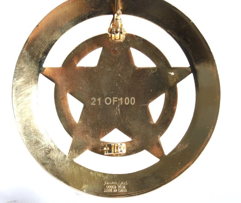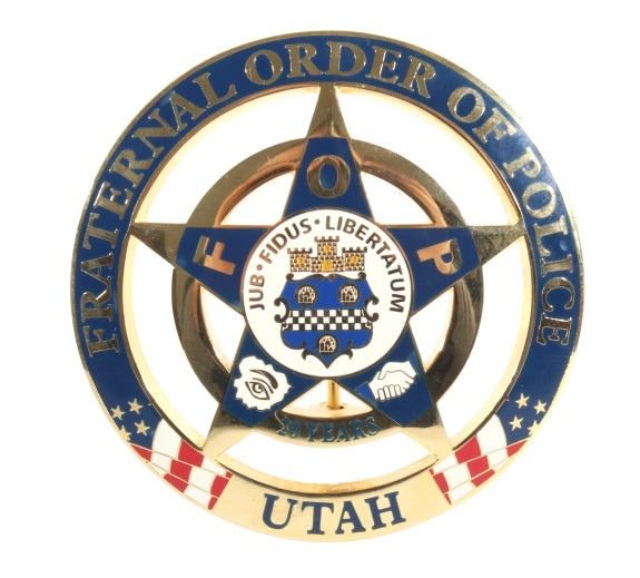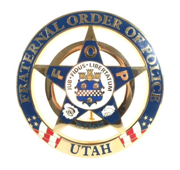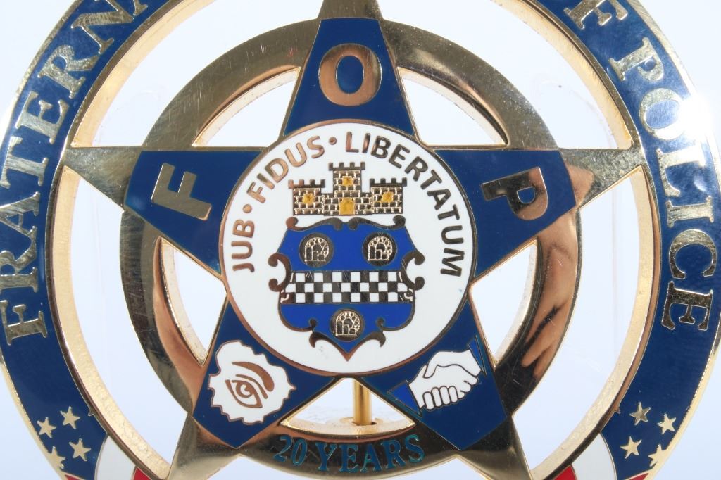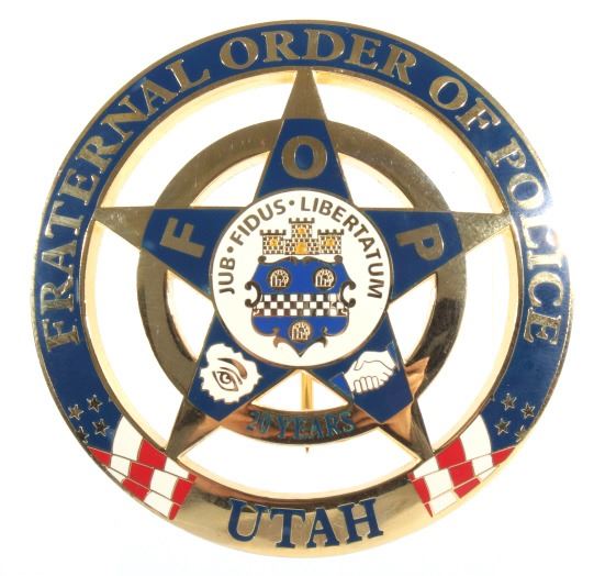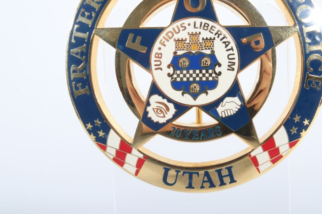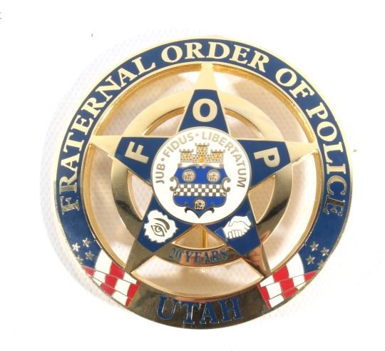 Featured in this lot we have a 20 years badge from the Utah branch of the Fraternal Order of Police. The order was founded in 1915 by two Pittsburgh patrol officers. The order was made as a sort of union though not call one due to anti-union feelings of the time. The badge is made of an iron alloy and finished to look like gold with the front showing a American flag pattern. The front of the badge reads "Fraternal Order of Police - Utah - F O P 20 Years - Jub-Fidus-Libertatum" across the front and the back is marked "21 of 100 - Symbol Arts Ogden Utah Made in China". The piece is in good condition overall. It measures 2 3/4" in diameter.