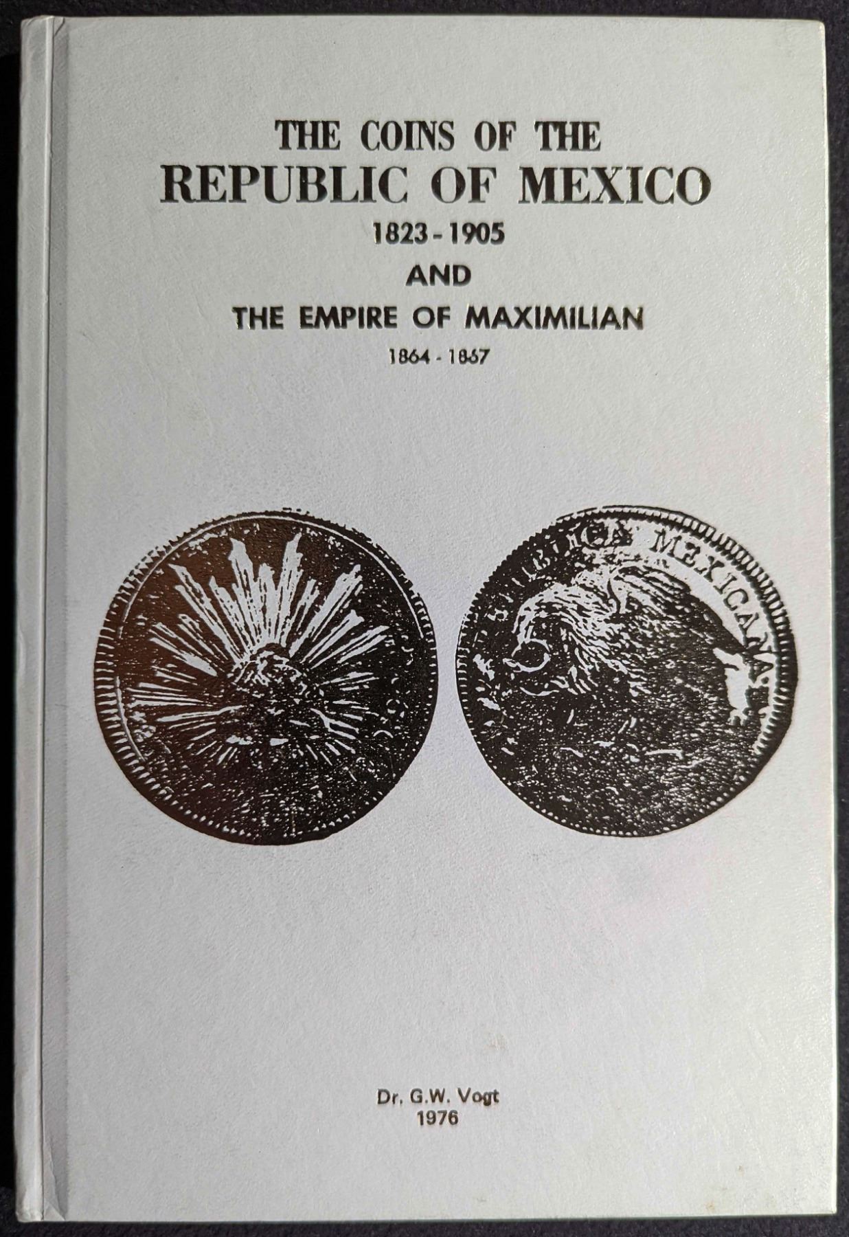 Utberg, Neil S. & Dr. George W. Vogt. THE COINS OF THE REPUBLIC OF MEXICO 1823-1905 AND THE EMPIRE OF MAXIMILIAN 1864-1867. Colonial Coins Inc. 1976. 12mo. (2), 85, (3) pages. Houston. original white buckram, gilt. b&w plated throughout. tables. Fine. Limited edition #233 of 1000 copies. This book is a reprint of Utberg's original work; this book is an illustrated catalog of the numismatic history of Mexico from the period 1823 to 1905. It also serves as a price guide to the coins minted during this period. The book is organized according to general type grouped by 8 reales, Roman numeral coins of 1882-1883, Balance Scale pesos, Liberty Cap pesos, Large Centavos, Small centavos and copper and brass minor reales. Coins are organized by date and mint and include pricing information and coin photos where possible. Lot weight: 0 lbs 11oz. Subject(s): Mexican Coinage.