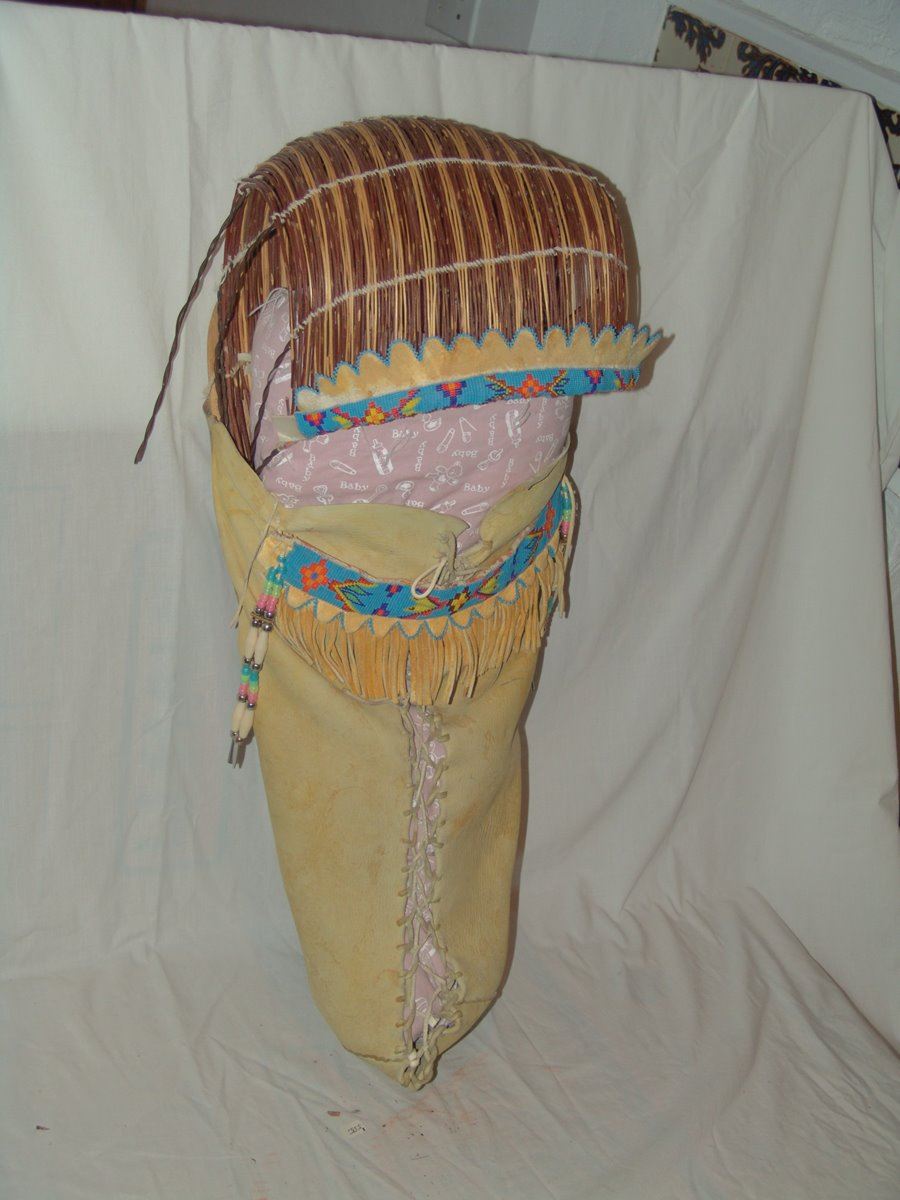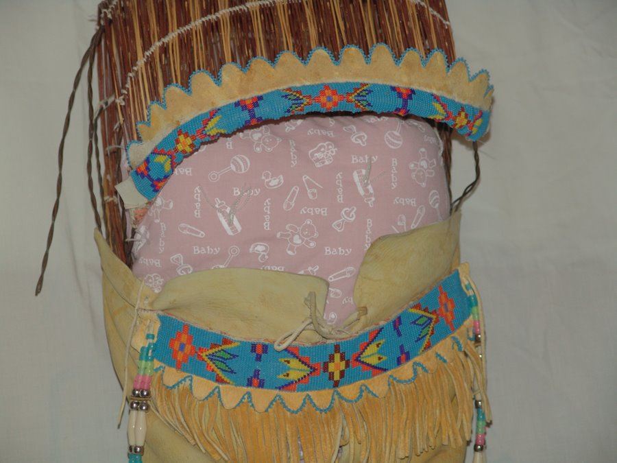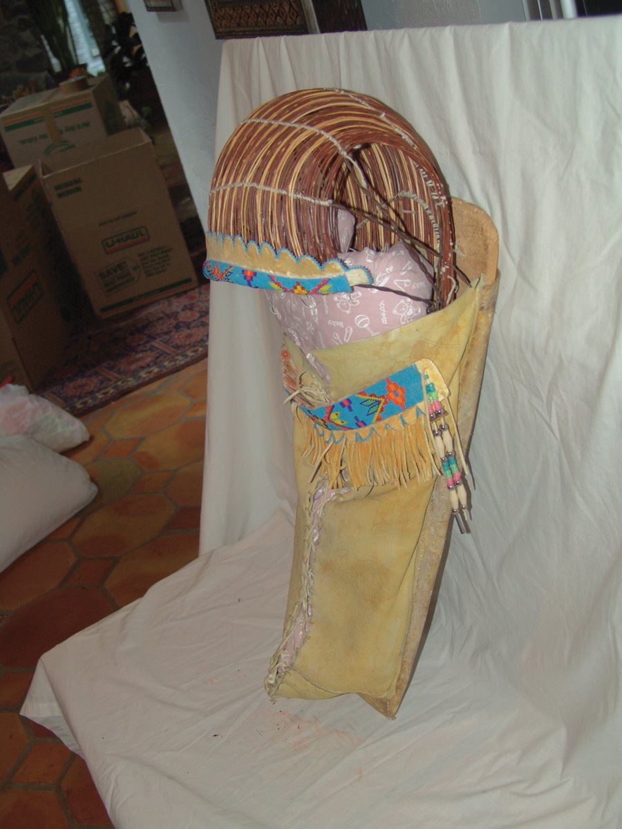 Traditional, full sized bent willow and wood, cradleboard made from buckskin, with beaded strap and brow, and mounted on a great early 1900s backboard.,,34 "