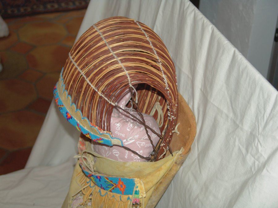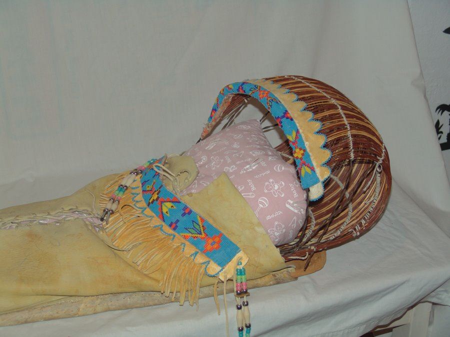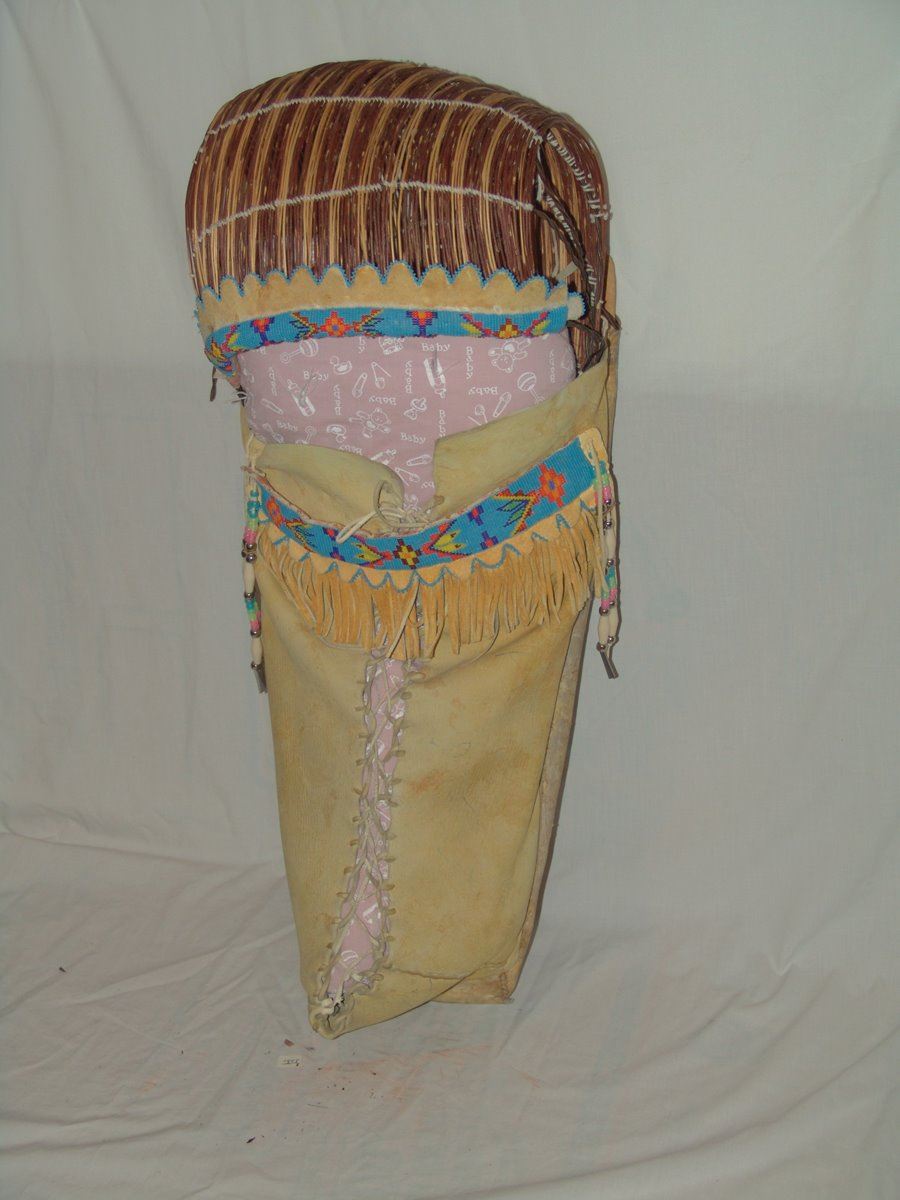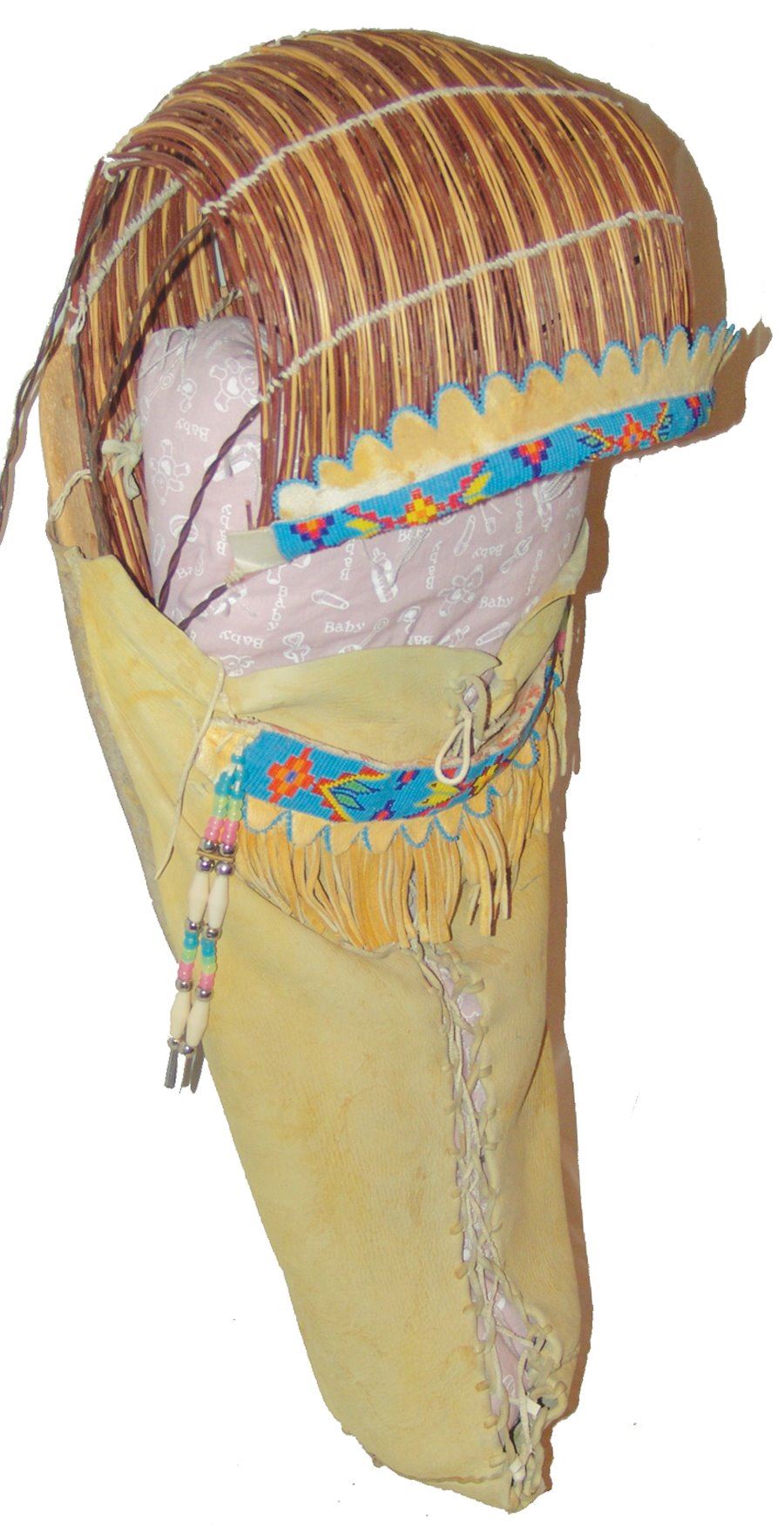 Traditional, full sized bent willow and wood, cradleboard made from buckskin, with beaded strap and brow, and mounted on a great early 1900s backboard.,,34 "