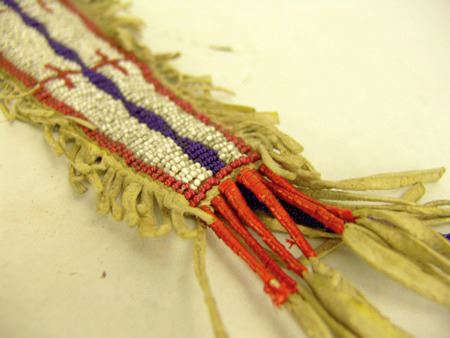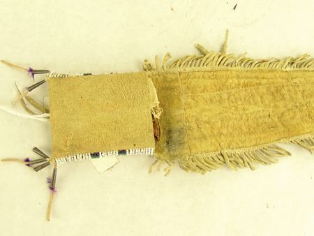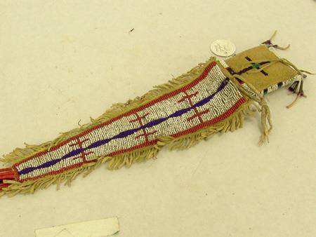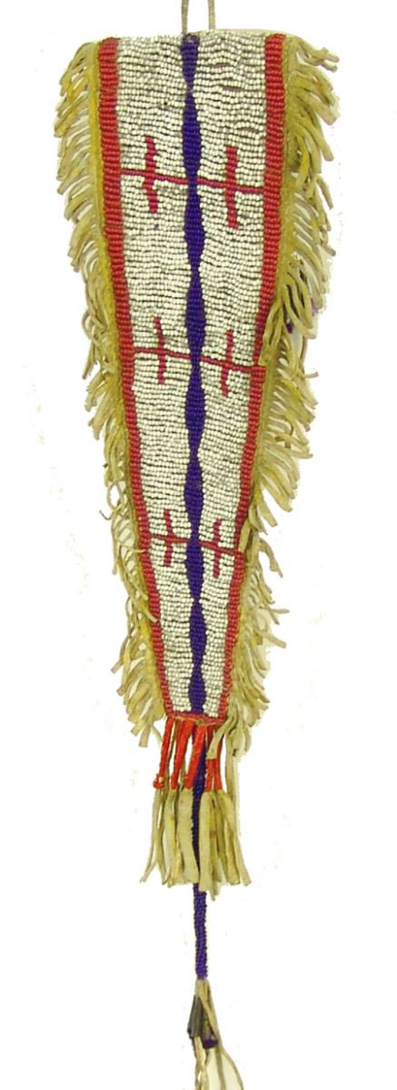 Early/Mid 1900s, Fine sinew sewn and lazy stitch beaded buckskin pouch with extra long triangular flap, some whiteheart beads, quilled suspensions, and fringe. Very good condition. 16" x 3"
