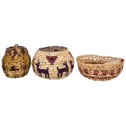 Ute Indian basket, pictorial basket made by Rachel Eyetoo, includes picture of her holding this 6" basket, Cherokee reed basket by Charlie Blackbear, 11"Dia. & Cherokee sewing basket made of honeysuckle vines by Martha Bark, 8"H, all Exc. condition.