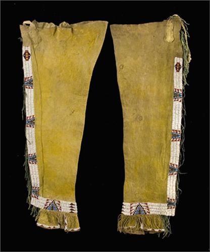 Ute Man's Leggings. 32" long. 11" wide. Dyed yellow and green. Beaded on hide. 19th century. Excellent condition. (est $2,000-3,000)