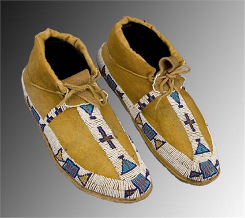 Ute Moccasins. 10 1/2" long. Strip beading on yellow dyed hide. 19th century. Excellent condition. (est $1,600-2,000)