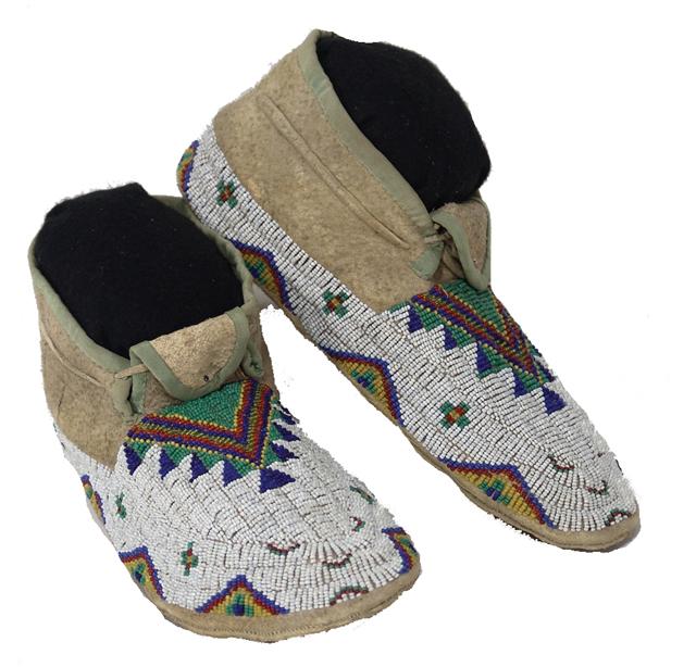 Early 1900s, Pair of choice, classic fully beaded moccasins, sinew sewn on native tanned elk hide with buffalo soles; in as-found, perfect condition. 11"