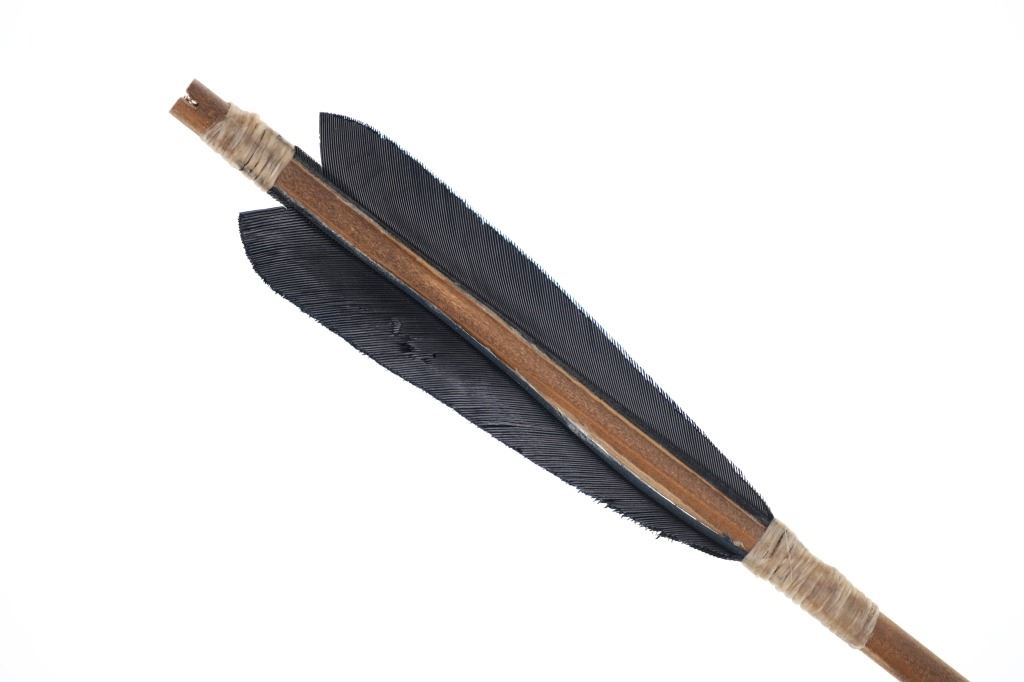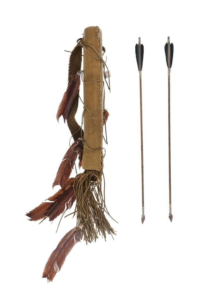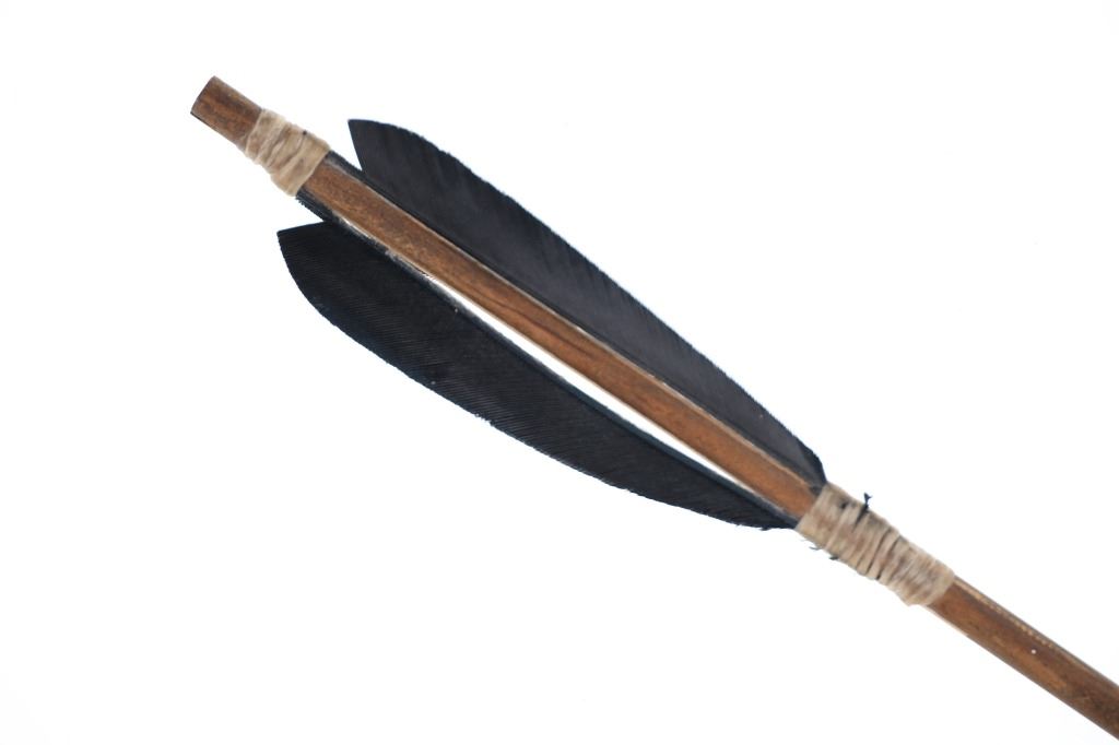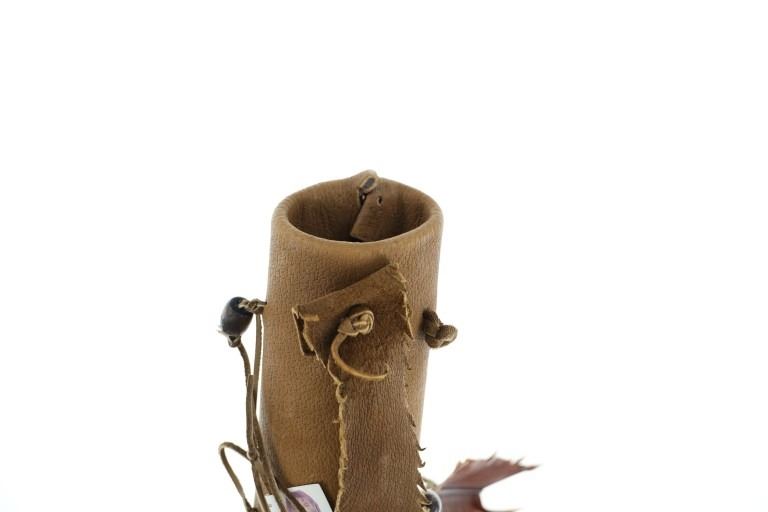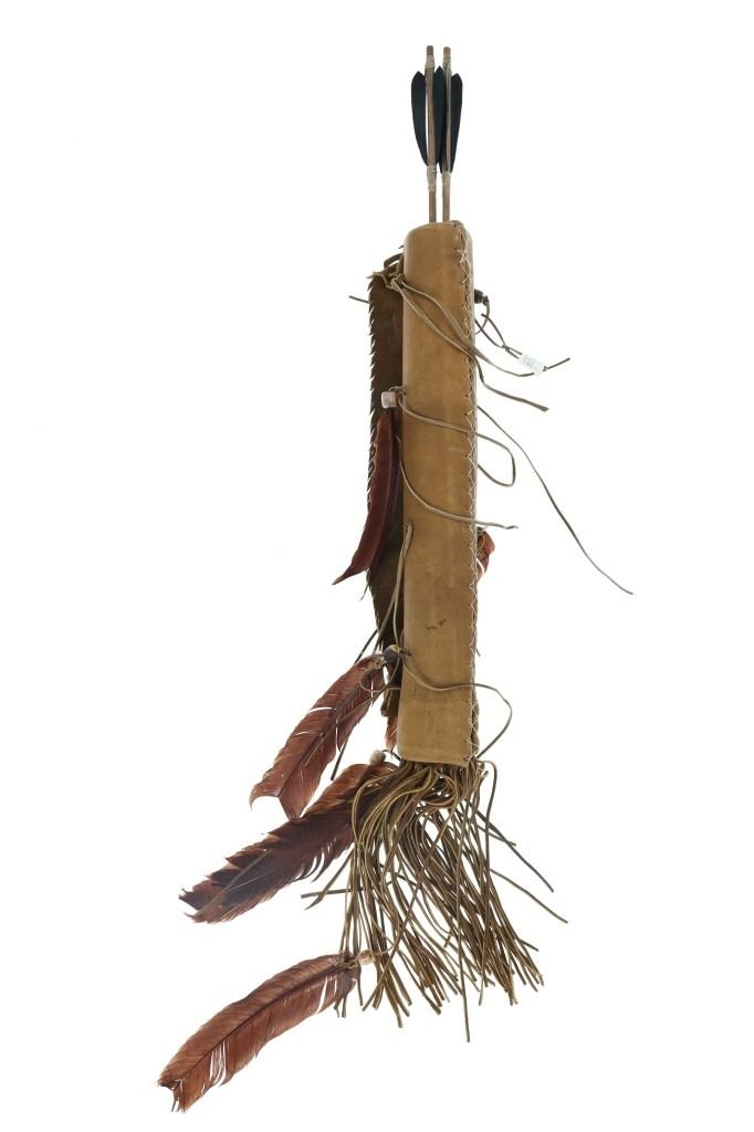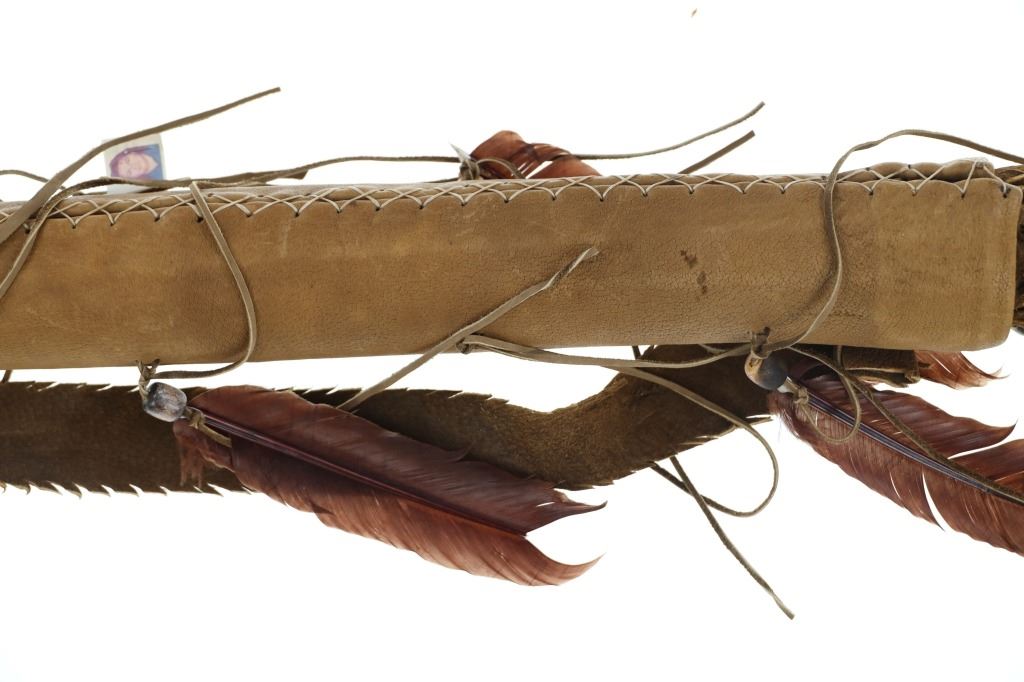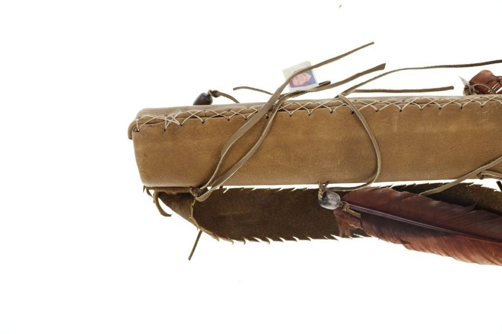 For your consideration is this Native American replica quiver and arrows done by Ute member Hilda Barela in Bloomfield, New Mexico in the early/mid 1990s. This is a replica set showing a leather quiver adorned with leather strips, faux feathers and carved wood beads. It features a leather shoulder strap for easy carrying and is holding two replica arrows. The arrows show faux feather fletching attached with string, and a carved stone arrowhead for each. The pieces in this replica set show good condition overall with wear present from their age and use over the years, but no major signs of damage is noted. The arrows measure 28 5/8" L x 1 3/8" W x 1 3/8" D, while the quiver measures 21 " L (40" L w/ adornments) x 3 1/4" W x 2 3/4" D. They have a collective weight of 1 pound and 8 ounces.