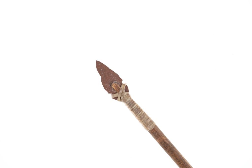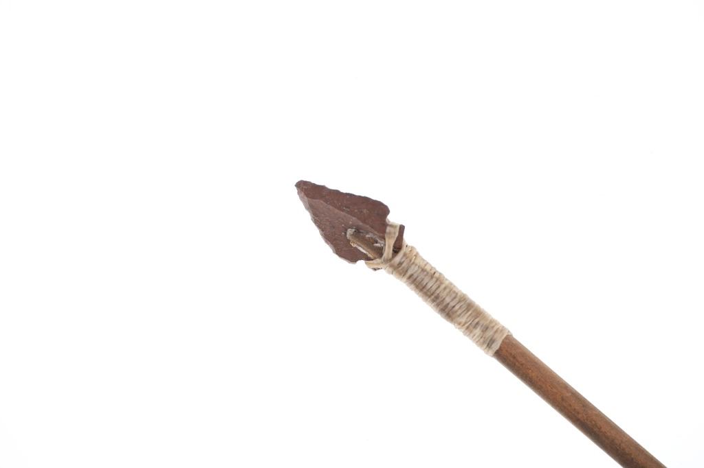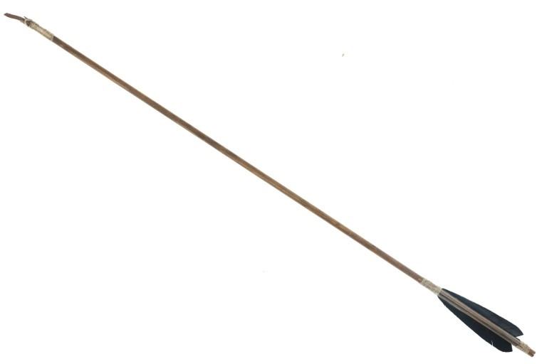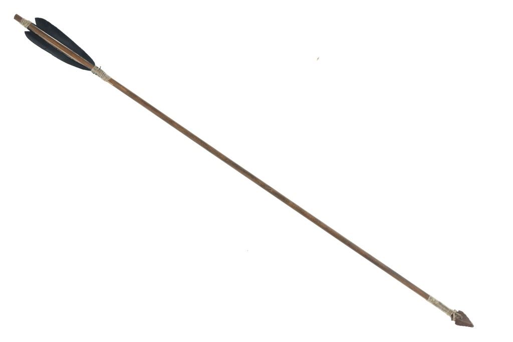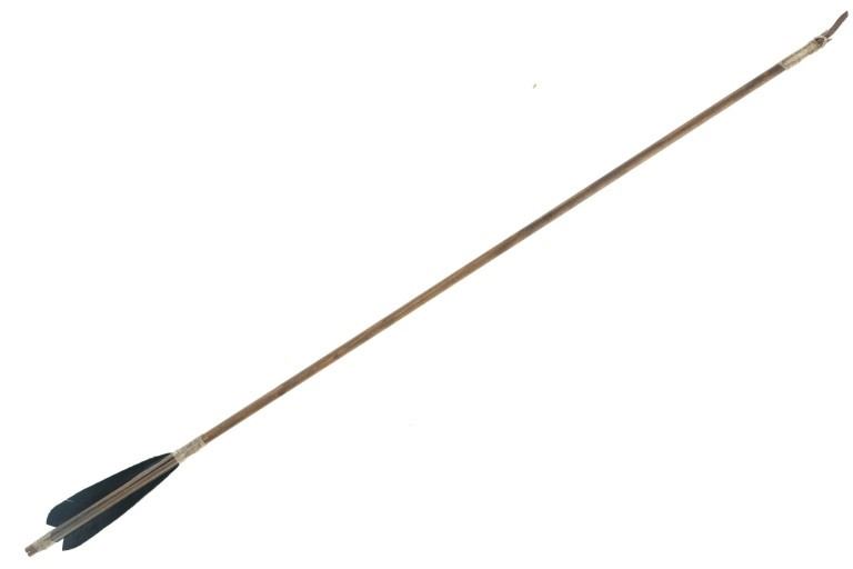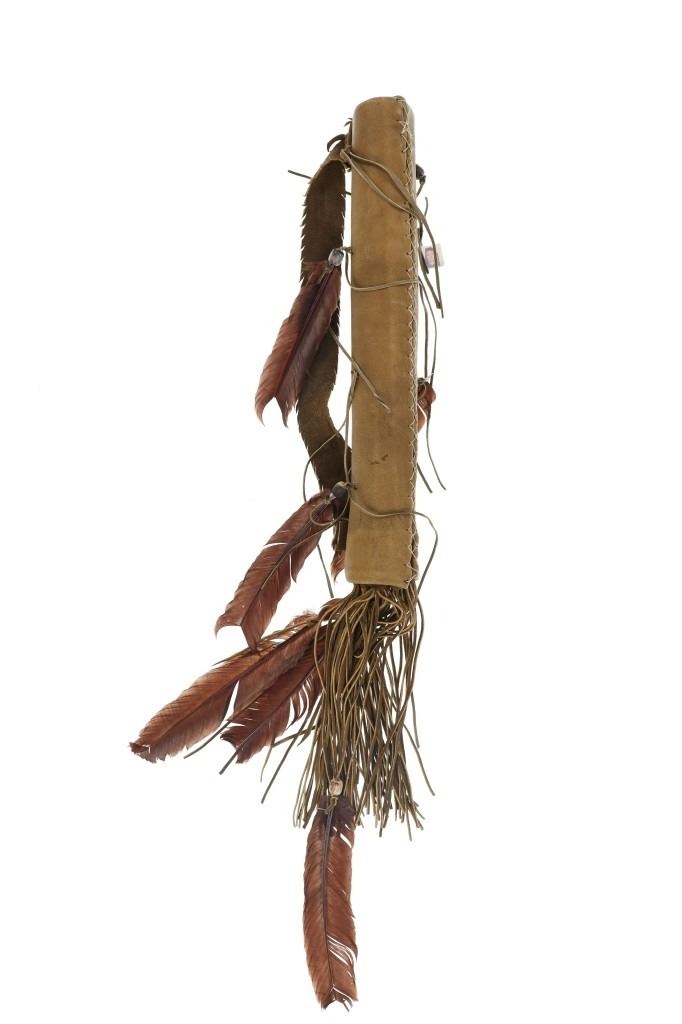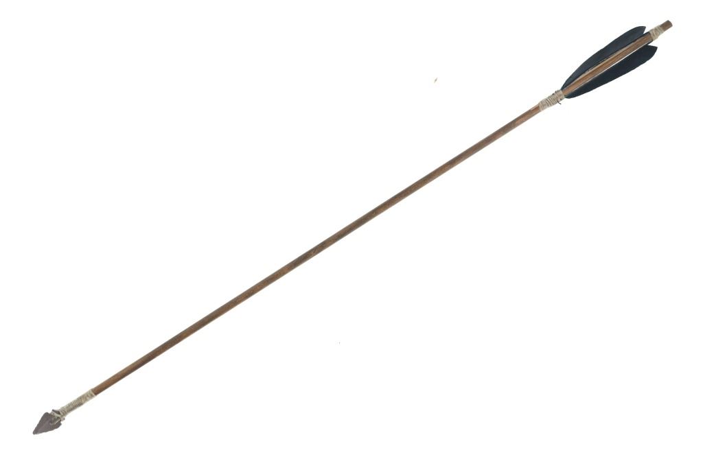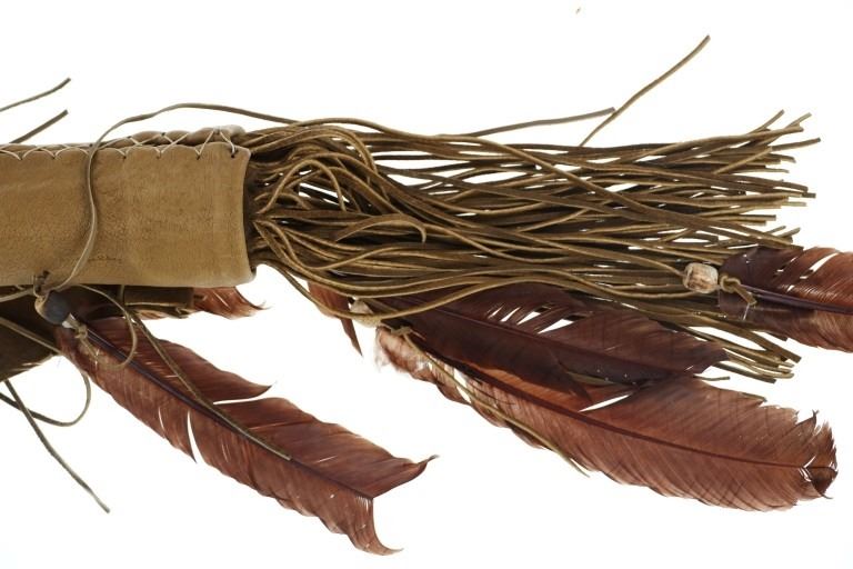 For your consideration is this Native American replica quiver and arrows done by Ute member Hilda Barela in Bloomfield, New Mexico in the early/mid 1990s. This is a replica set showing a leather quiver adorned with leather strips, faux feathers and carved wood beads. It features a leather shoulder strap for easy carrying and is holding two replica arrows. The arrows show faux feather fletching attached with string, and a carved stone arrowhead for each. The pieces in this replica set show good condition overall with wear present from their age and use over the years, but no major signs of damage is noted. The arrows measure 28 5/8" L x 1 3/8" W x 1 3/8" D, while the quiver measures 21 " L (40" L w/ adornments) x 3 1/4" W x 2 3/4" D. They have a collective weight of 1 pound and 8 ounces.