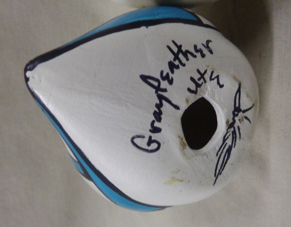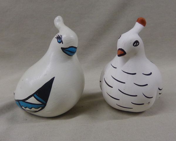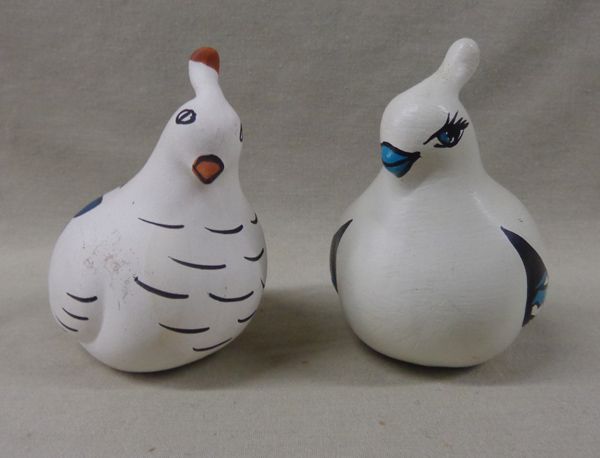 Ute Pottery Quail One Signed by Grayfeather, largest measures 4''H x 4''L x 3''W, painted in hues of brown, black, and turquoise on white