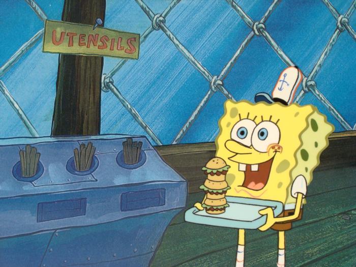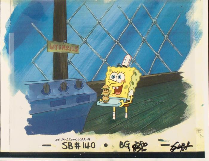 This animation cel and reproduction background are from the Nickelodeon TV show SpongeBob Squarepants. The story takes place under the deep blue sea in Bikini Bottom, where SpongeBob resides. SpongeBob, who is a yellow, porous sponge, is your typical happy-go-lucky character, as he is always cheerful and enjoys making people laugh. Patrick Star, SpongeBob's neighbor who is a starfish, is your average children's show idiot, as he boasts knowing nothing and is often getting himself into ridiculous situations. Between the homes of these two lies the home of the miserable Squidward, a squid, who is known for being grouchy and playing tricks on SpongeBob and Patrick. Both SpongeBob and Squidward work at the Krusty Krab, a fast food business run by the greedy money-loving Mr. Krabs, a crab, the arch rival of the evil, possibly misunderstood, Plankton. Another neighbor, Sandy Cheeks, an athletic squirrel who normally wears an astronaut's space suit, was introduced in "Tea at the Treedome." She spends most of her time inventing and experimenting. SpongeBob is next to the utensils table.Original Printed Background and Animated Cel Overall Size of Background: 10 1/2" x 17" Overall Size of the Cel: 10 1/2" x 12 1/2" Very good condition This is an original hand-painted cel set-up used in the production of an episode of "SpongeBob SquarePants." Each one-of-a-kind set-up represents a slight change in position of the characters. When individually photographed and projected in rapid succession, the images appear to move.
