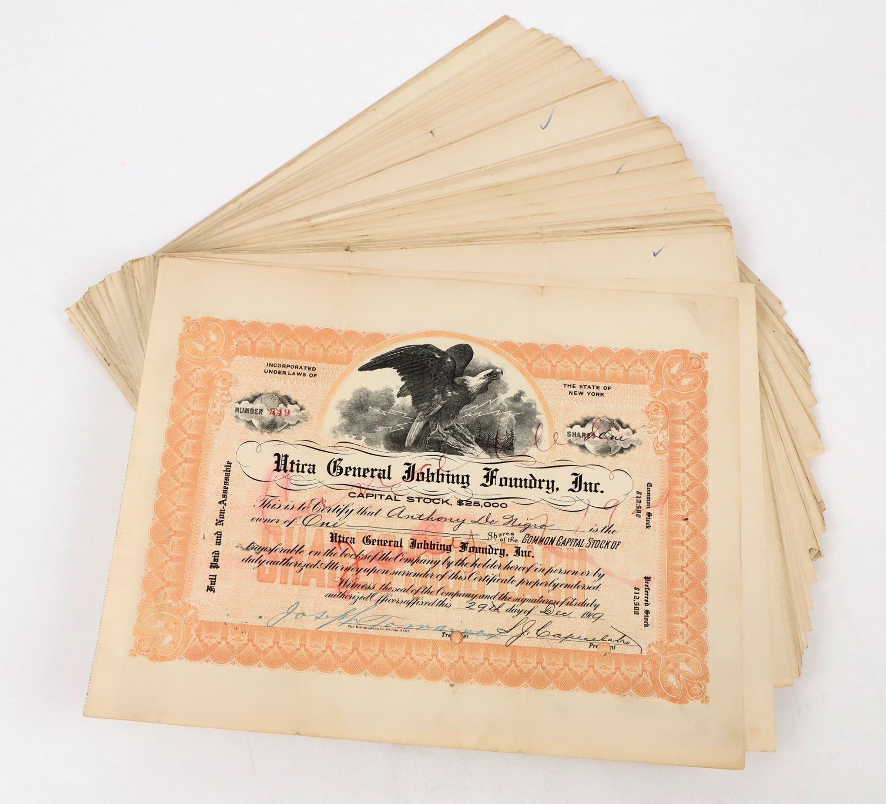 50+. I/U, I/C. Issued 1919-20. VG or better . Utica General Jobbing Foundry, Inc., lots of revenue stamps. Browne-Green Co. printer.