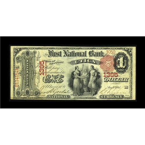 <B>Utica, NY</B></I> - $1 1875 Fr. 385 <B>The First NB</B></I> Ch. # 1395<BR>A nice early note from this otherwise common bank. <B>Very Fine.</B></I>