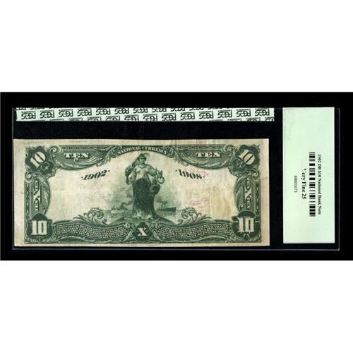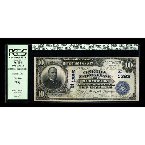 <B>Utica, NY</B></I> - $10 1902 Date Back Fr. 616 <B>The Oneida NB</B></I> Ch. # (E)1392<BR>Bank officers G.A. Niles and Geo. L. Bradford are found on this note. Mr. Niles would go on to serve this bank as president. <B>PCGS Very Fine 25.</B></I><BR><BR><b>Shipping:</b> Coins & Currency (<a target="_blank" href="http://www.heritageauctions.com/common/shipping.php">view shipping information</a>)