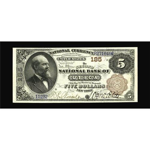 <B>Utica, NY</B></I> - $5 1882 Brown Back Fr. 466 <B>The Second NB</B></I> Ch. # 185<BR>One picture is easily worth a thousand words here, as title layouts just don't get much better than the one which graces this lovely pen signed $5 Brown Back. Expect a real battle before the hammer drops on this lot tonight. <B>Very Fine-Extremely Fine.</B></I>