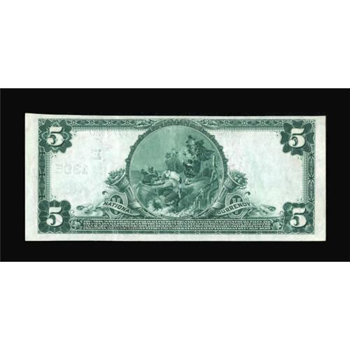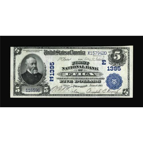 <B>Utica, NY</B></I> - $5 1902 Plain Back Fr. 598 <B>The First NB</B></I> Ch. # (E)1395<BR> Bright, fresh, and new but for two light folds. <B>Extremely Fine-About Uncirculated, </B></I>about as nice as a note can be without grading fully New. <BR><I>From The Thomas A. Bergin Collection</B></I><BR><BR><b>Shipping:</b> Coins & Currency (<a target="_blank" href="http://www.heritageauctions.com/common/shipping.php">view shipping information</a>)