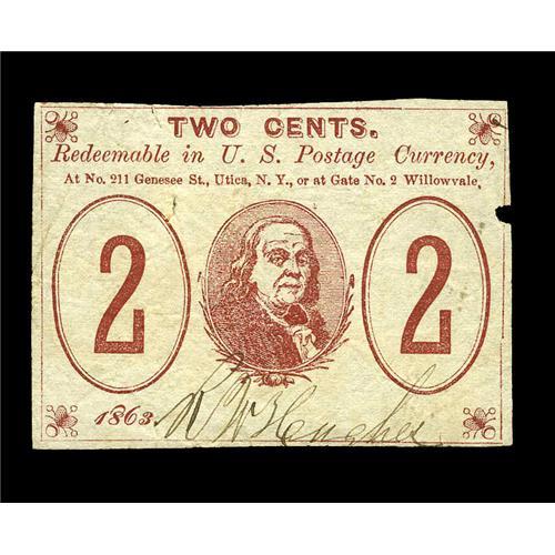 <B>Utica, NY- R.W. Hencher</B></I> 2¢ 1863 Harris UNL<BR>The first scrip we've seen from this issuer, who is unlisted in the Harris reference. It's redeemable in U.S. Postage Currency either in Utica (which was a hotbed of scrip issuers deeming their notes redeemable in Postage Currency) or in Willowvale. <B>Very Fine,</B></I> with a tiny nick out of the left side.