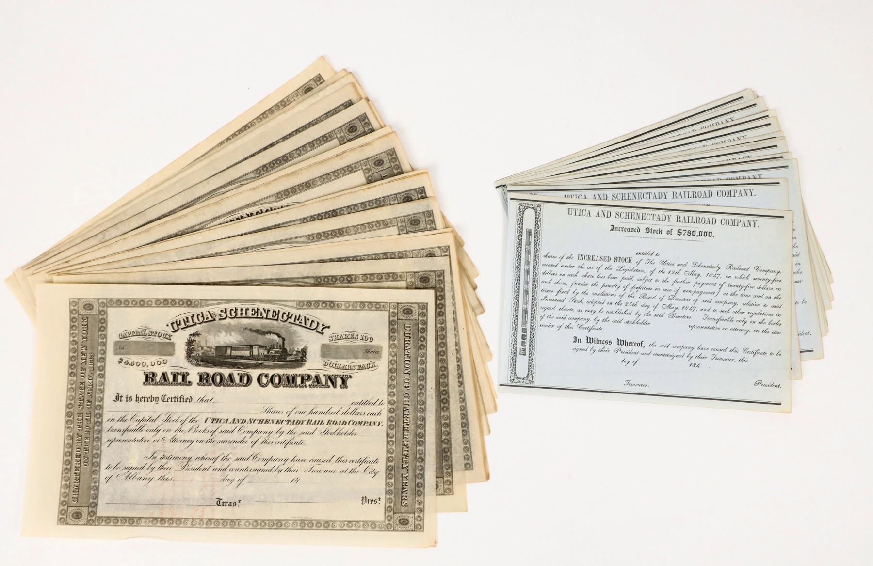 Utica and Schenectady Railroad Company stock certificates, two styles, both unissued: pale blue ~13pcs. 7.625 x 5.5 in., black and white, ~27 pcs. 10.75 x 6.75 in.,
